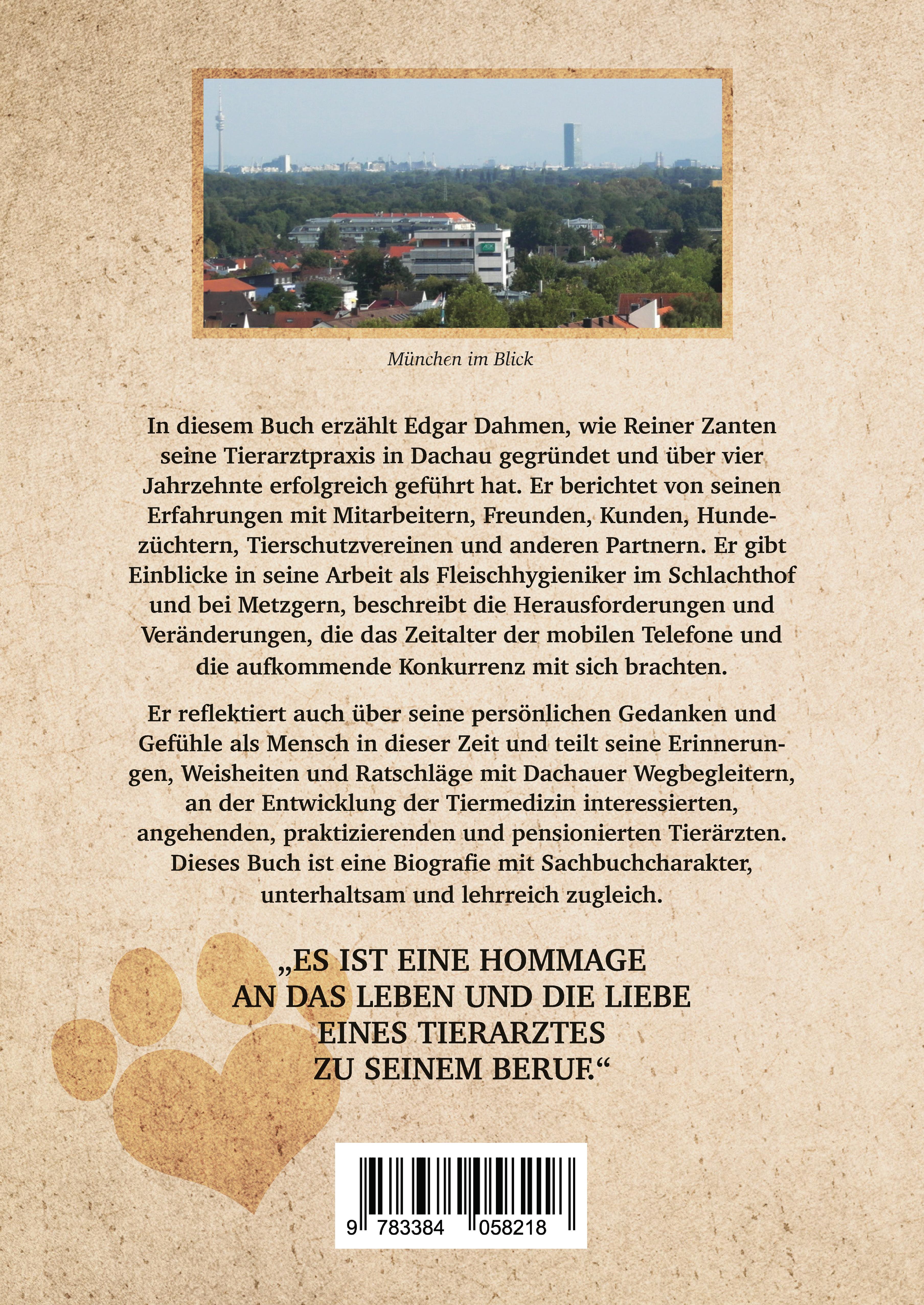 In diesem Buch erzählt Edgar Dahmen, wie Reiner Zanten seine Tierarztpraxis in Dachau gegründet und über vier Jahrzehnte erfolgreich geführt hat. Er berichtet von seinen Erfahrungen mit Mitarbeitern, Freunden, Kunden, Hundezüchtern, Tierschutzvereinen und anderen Partnern. Er gibt Einblicke in seine Arbeit als Fleischhygieniker im Schlachthof und bei Metzgern, beschreibt die Herausforderungen und Veränderungen, die das Zeitalter der mobilen Telefone und die aufkommende Konkurrenz mit sich brachten. Er reflektiert auch über seine persönlichen Gedanken und Gefühle als Mensch in dieser Zeit und teilt seine Erinnerungen, Weisheiten und Ratschläge mit Dachauer Wegbegleitern, an der Entwicklung der Tiermedizin interessierten, angehenden, praktizierenden und pensionierten Tierärzten.