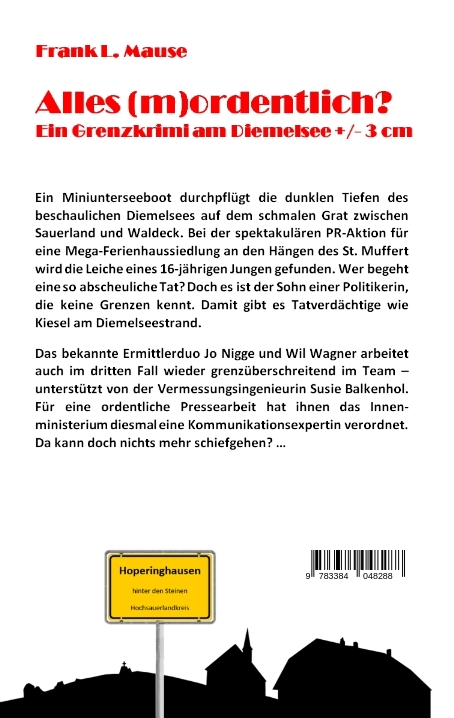 Frank L. Mause, geboren 1964 in Bruchhausen an den Steinen (Hochsauerland), durchlief ab 1984 eine knapp zehn Jahre währende Laufbahn vom Rekrut bis zum Offizier. In dieser Zeit studierte er Geodäsie an der Universität der Bundeswehr München. 1996 schloss er das 2. Staatsexamen ab und trat in den hessischen Landesverwaltungsdienst ein. Seit 2010 ist er Leiter des Amtes für Bodenmanagement Korbach. Mause lebt mit seiner Frau in Bad Arolsen, fährt gern Rennrad und liest viel. Er veröffentlichte 2018 seinen ersten, in sich abgeschlossenen Grenzkrimi "Mord(s)genau - Jetzt wird's grenzlich". 2021 folgte der zweite um das Ermittlerduo Jo Nigge und Wil Wagner "(M)Ortsgericht - Es bleibt grenzlich". Und auch im vorliegenden "Alles (m)ordentlich? Ein Grenzkrimi am Diemelsee +/- 3 cm" wird wieder auf dem schmalen Grat zwischen Sauerland und Waldeck ermittelt.