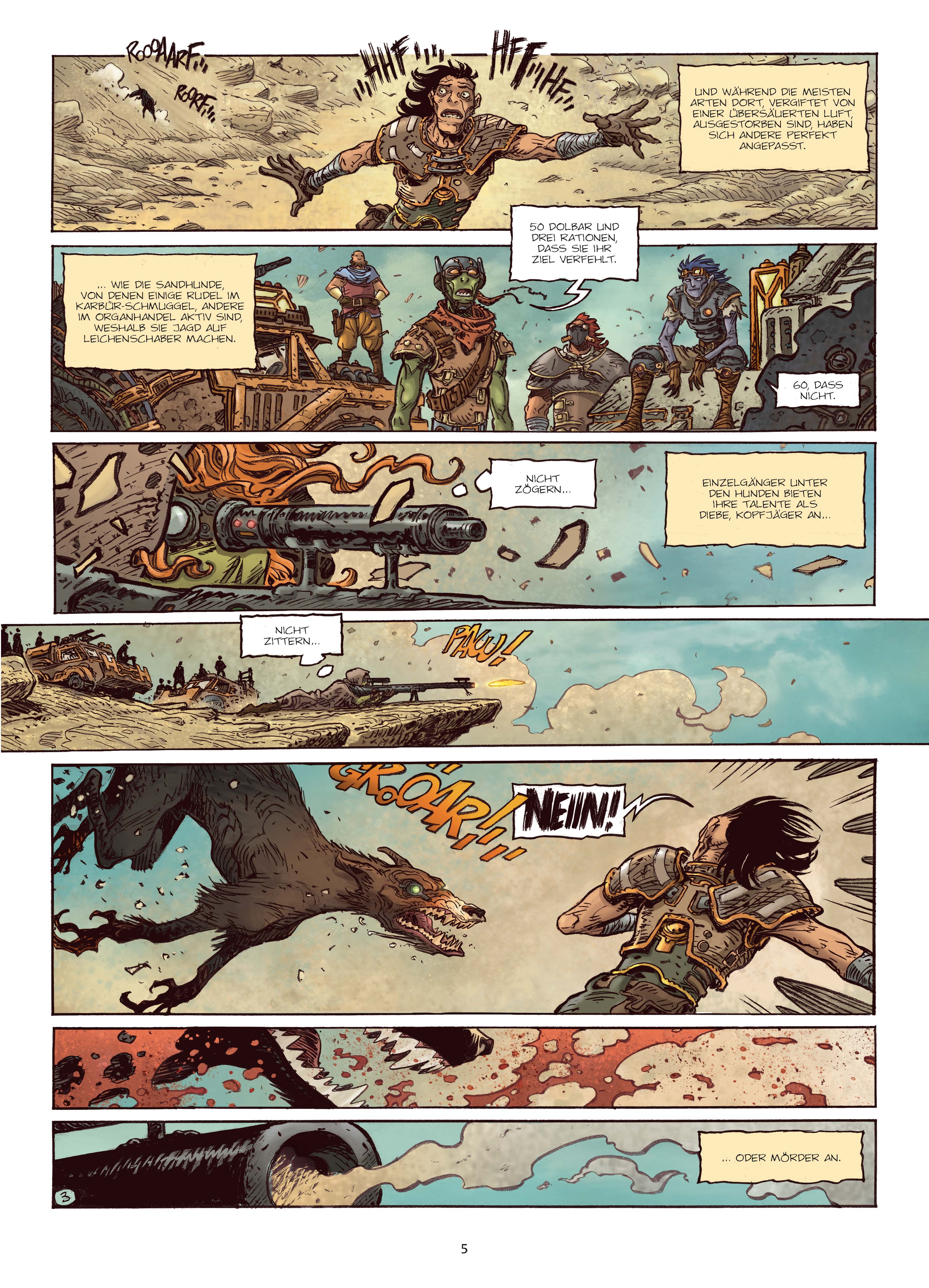 Jahre sind vergangen... Die UCC Dolores ist auf dem Wüstenplaneten Tishala gestrandet, wo unzählige Bohrtürme die reichen Bodenschätze für die mächtige Handelsliga fördern. Auf dieser Welt, die am Rand eines ökologischen Kollaps steht, ist Monys Tochter Luna schwer erkrankt, ihre Lungen wurden von Gift zerfressen. Die einzige Lösung wäre, Tishala schnellstmöglich zu verlassen, doch haben die toxischen Winde des Planeten das Navigationssystem der Dolores zerstört. Die Reparatur ist teuer, und so ist Mony gezwungen, ihre Fähigkeiten als Meisterschützin in den Dienst des berüchtigten Captain Sharkis und seiner gesetzlosen Söldnerarmee zu stellen...Mit seiner ersten komplett eigenen Story reißt Didier Tarquin mit der einen Hand Genregrenzen ein, während er mit der anderen eine aufregende Weltraum-Odyssee vorlegt - voller charismatischer Helden, sinistrer Schurken und Verweise auf die größten Sci-Fi-Hits unserer Zeit!