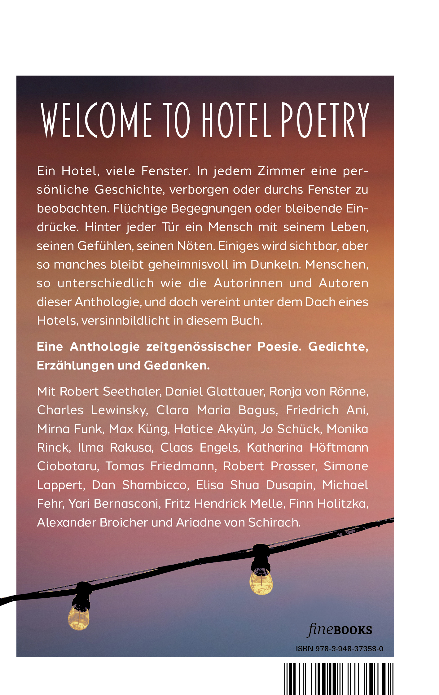 WELCOME TO THE HOTEL POETRY. Ein Hotel, viele Fenster. In jedem Zimmer eine persönliche Geschichte, verborgen oder durchs Fenster zu beobachten. Flüchtige Begegnungen oder bleibende Eindrücke. Hinter jeder Tür ein Mensch mit seinem Leben, seinen Gefühlen, seinen Nöten. Einiges wird sichtbar, aber so manches bleibt geheimnisvoll im Dunkeln. Menschen, so unterschiedlich wie die Autorinnen und Autoren dieser Anthologie, und doch vereint unter dem Dach eines Hotels, versinnbildlicht in diesem Buch.Eine Anthologie zeitgenössischer Poesie. Gedichte, Erzählungen und Gedanken. Mit Robert Seethaler, Daniel Glattauer, Ronja von Rönne, Charles Lewinsky, Clara Maria Bagus, Friedrich Ani, Mirna Funk, Max Küng, Hatice Akyün, Jo Schück, Monika Rinck, Ilma Rakusa, Claas Engels, Katharina Höftmann Ciobo taru, Thomas Friedmann, Robert Prosser, Simone Lappert, Dan Shambicco, Elisa Shua Dusapin, Michael Fehr, Yari Bernasconi, Fritz Hendrick Melle, Finn Holitzka, Alexander Broicher und Ariadne von Schirach.*Die beiden vorliegenden Editionen sind inhaltsgleich*