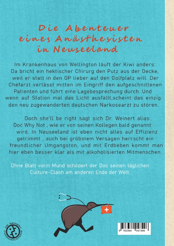 Die Abenteuer eines Anästhesisten in NeuseelandIm Krankenhaus von Wellington läuft der Kiwi anders: Da bricht ein hektischer Chirurg den Putz aus der Decke, weil er statt in den OP lieber auf den Golfplatz will. Der Chefarzt verlässt mitten im Eingriff den aufgeschnittenen Patienten und führt eine Lagebesprechung durch. Und wenn auf Station mal das Licht ausfällt, scheint das einzig den neu zugewanderten deutschen Narkosearzt zu stören.Doch she'll be right sagt sich Dr. Weinert alias Doc Why Not, wie er von seinen Kollegen bald genannt wird. In Neuseeland ist eben nicht alles auf Effizienz getrimmt, auch bei gröbstem Versagen herrscht ein freundlicher Umgangston, und mit Erdbeben kommt man hier eben besser klar als mit alkoholisierten Mitmenschen.Ohne Blatt vorm Mund schildert der Doc seinen täglichen Culture-Clash am anderen Ende der Welt.