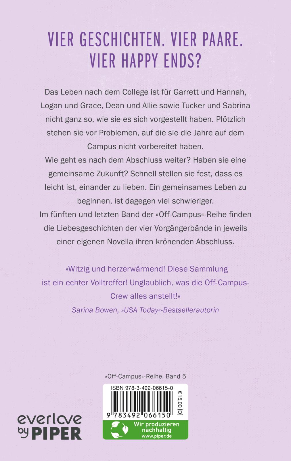 Im fünften und letzten Band der »Off-Campus«-Reihe finden die Liebesgeschichten der vier Vorgängerbände in jeweils einer eigenen Novella ihren krönenden Abschluss.