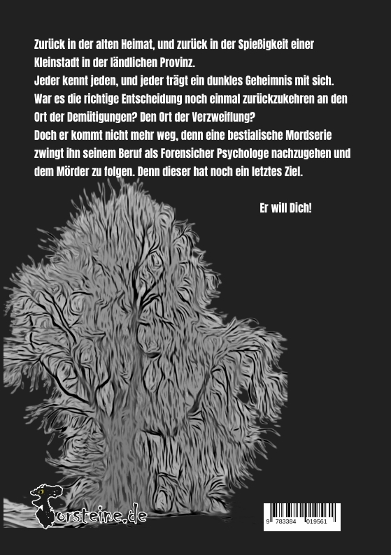 Zurück in der alten Heimat. Aber auch zurück in der Spießigkeit einer ländlichen Kleinstadt. Jeder kennt jeden, und jeder trägt ein dunkles Geheimnis mit sich. Eine grässliche Mordserie beginnt und zwingt Ihn seinem Beruf als Forensischer Psychologe nach zu gehen. Er folgt der Spur des Mörders, denn dieser hat ein letztes Ziel.Er will Dich!Ein packender dunkler Psychothriller welcher uns in die Abgründe der menschlichen Seele führt.