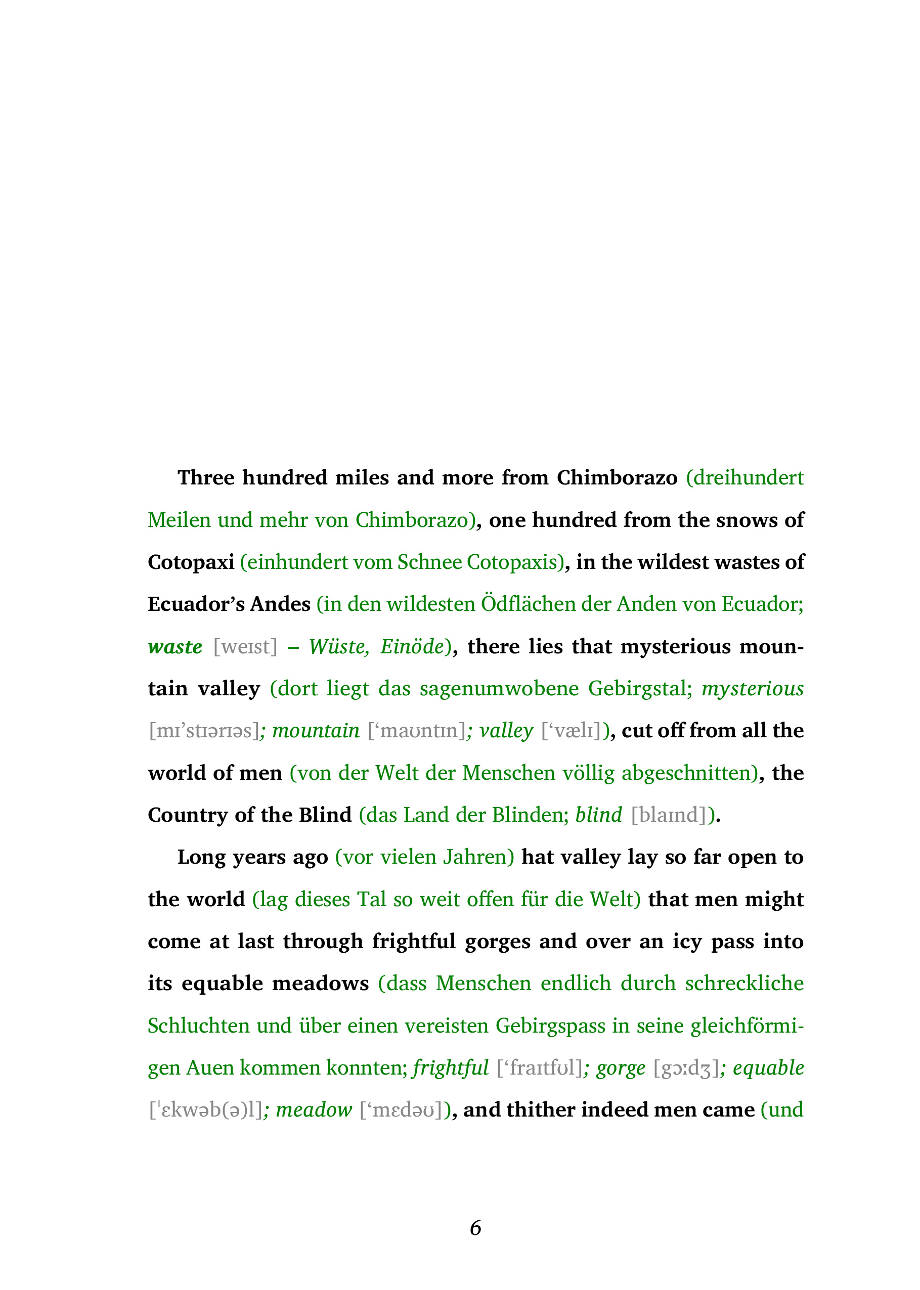 Entdecken Sie die Welt der Fremdsprachen auf eine ganz neue Weise mit der Lesemethode von Ilya Frank, perfekt für alle ab dem Sprachniveau A2. Diese innovative Methode kombiniert Originaltexte mit klaren, direkten Übersetzungen und bietet zusätzliche Erläuterungen direkt im Lesefluss, um ein tiefes Verständnis und schnelles Lernen zu fördern. Ob Sie Ihre Sprachkenntnisse verbessern oder in eine neue Sprache eintauchen möchten, diese Methode bietet ein einzigartiges und effektives Leseerlebnis. Dank der integrierten Hörbücher wird auch das Hörverständnis trainiert.Lesemethode von Ilya Frank ist ideal für alle, die ihre Sprachkenntnisse effektiv erweitern wollen, ohne den natürlichen Lesefluss zu unterbrechen.Entdecken Sie das packende Meisterwerk "The Country of the Blind" - eine Geschichte, die Sie in eine verborgene Welt entführt. In den abgelegenen Anden Ecuadors liegt das mysteriöse Tal des Blindenlandes, abgeschnitten von der Außenwelt durch eine katastrophale Naturkatastrophe. Hier hat sich eine Gemeinschaft von Blinden gebildet, die über Generationen hinweg in völliger Isolation lebt. Als Nuñez, ein Sehender, in ihr Tal stürzt, wird er mit einer Welt konfrontiert, in der Sehen nicht nur wertlos, sondern sogar ein Hindernis ist. Diese fesselnde Erzählung von H.G. Wells stellt grundlegende Fragen über Wahrnehmung, Anpassung und was es wirklich bedeutet, "zu sehen". Entdecken Sie die Spannungen zwischen Nuñez' Welt des Sehens und der einzigartigen Kultur der Blinden, in einem Tal, wo der Spruch "Im Land der Blinden ist der Einäugige König" auf die Probe gestellt wird. Ein Muss für jeden Literaturliebhaber, der sich nach einer Geschichte sehnt, die den Geist herausfordert und das Herz berührt.Ungekürzter Originaltext. Zweisprachiges Buch Englisch-Deutsch. Innovative Lesemethode: https://easyoriginal.com/lesemethode/