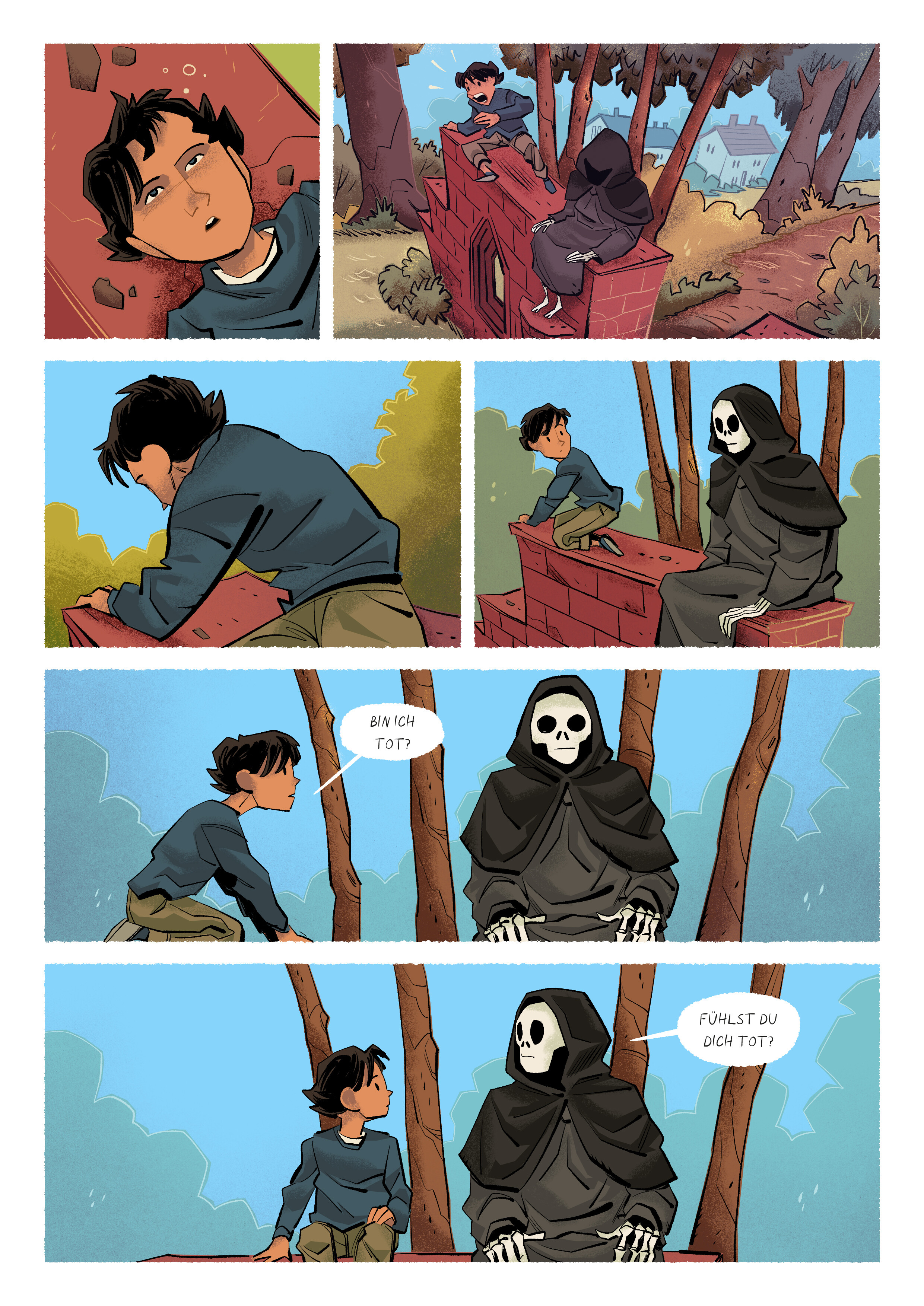 Das war knapp! Beim Herumklettern in der alten Klosterruine wäre Lukas beinahe abgestürzt. Er hätte sich den Hals brechen können! Das sieht der Tod offenbar ähnlich, denn er sitzt bereits neben Lukas: Kutte, Kapuze, Totenschädel, das volle Programm. Obwohl es für ihn hier nichts zu holen gibt, schaut Tod von nun an ab und zu bei Lukas vorbei - wenn schließlich schon mal ein junger Mensch an den Sensenmann glaubt!Als einige Zeit später Lukas' väterlicher Freund Johann im Dorfteich ertrinkt, ist es Tod, der dem Jungen fachkundig versichert, dass dies kein Unfall war! Mit viel Scharfsinn und ein klein wenig Magie machen die beiden sich auf Spurensuche.Was macht Gevatter Tod dieser Tage, da kaum noch jemand an ihn glaubt? In seiner glorreichen Vergangenheit schwelgen und still in Vergessenheit geraten? Nein. Er schließt sich mit einem cleveren Jungen zusammen und gründet die ungewöhnlichste Detektei des Diesseits!