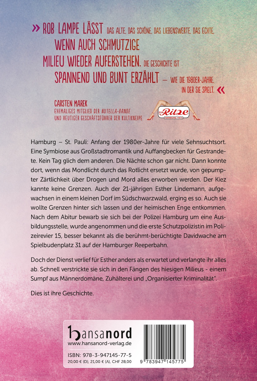 Allerdings war die 21-jährige Protagonistin nicht irgendeiner Dienststelle zugeteilt, sie war im Einsatz auf der Hamburger Reeperbahn. Dem Sündenpfuhl aus Live-Sex, Gewalt und Drogen, dominiert von den schweren Jungs der Zuhälterringe GMBH und Nutella-Bande. Und dennoch war dies nur die eine Seite der Medaille. Das Polizeirevier 15 hatte die andere für den unbedarften Nachwuchs im Gepäck - die der männlichen Kollegen. Männer, die eine weibliche Partnerin gern zu Hause in der Küche und im Bett wähnten, aber bitteschön nicht neben sich beim Dienst auf der Straße. Zu geringe physische Belastbarkeit, fehlende körperliche Kraft und überhaupt widerspreche eine weibliche Streifenpolizistin dem »gelernten« Frauenbild waren nur einige der vorgebrachten Argumente und Demütigungen hinter vorgehaltener Hand. Auch in der Öffentlichkeit wurde das traditionelle Frauenbild geradezu grotesk diskutiert: Konnten Schutzpolizistinnen Waffengewalt ausüben, ohne ihre Weiblichkeit zu verlieren oder die Männlichkeit und Schlagkraft der Polizei zu schwächen? Kurzum: Esther, mit großen Plänen aus dem Schwarzwald gestartet, hatte nicht den Hauch einer Ahnung, auf was sie sich im hohen Norden eingelassen hatte und dass ihr Leben als bald komplett aus den Fugen geraten würde.