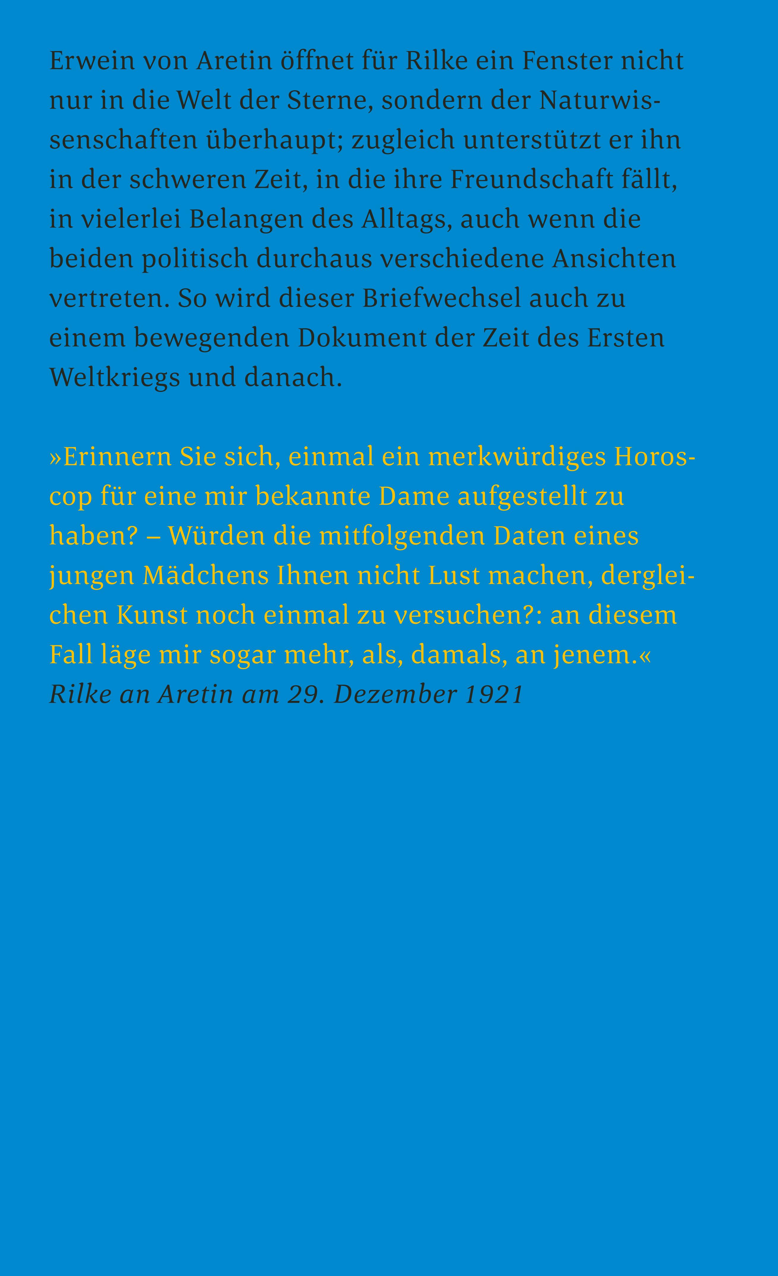 Für Rilke ist die Begegnung mit Aretin äußerst inspirierend: Vielfältige Metaphern aus dem Bildvorrat von Astronomie und astrologischer Kosmologie durchziehen das lyrische Spätwerk, das in den Jahren der Freundschaft mit Aretin entsteht. Der Briefwechsel zwischen dem »Dichter und seinem Astronomen« wirft ein Schlaglicht auf bisher kaum bekannte Aspekte von Rilkes Leben und Werk.