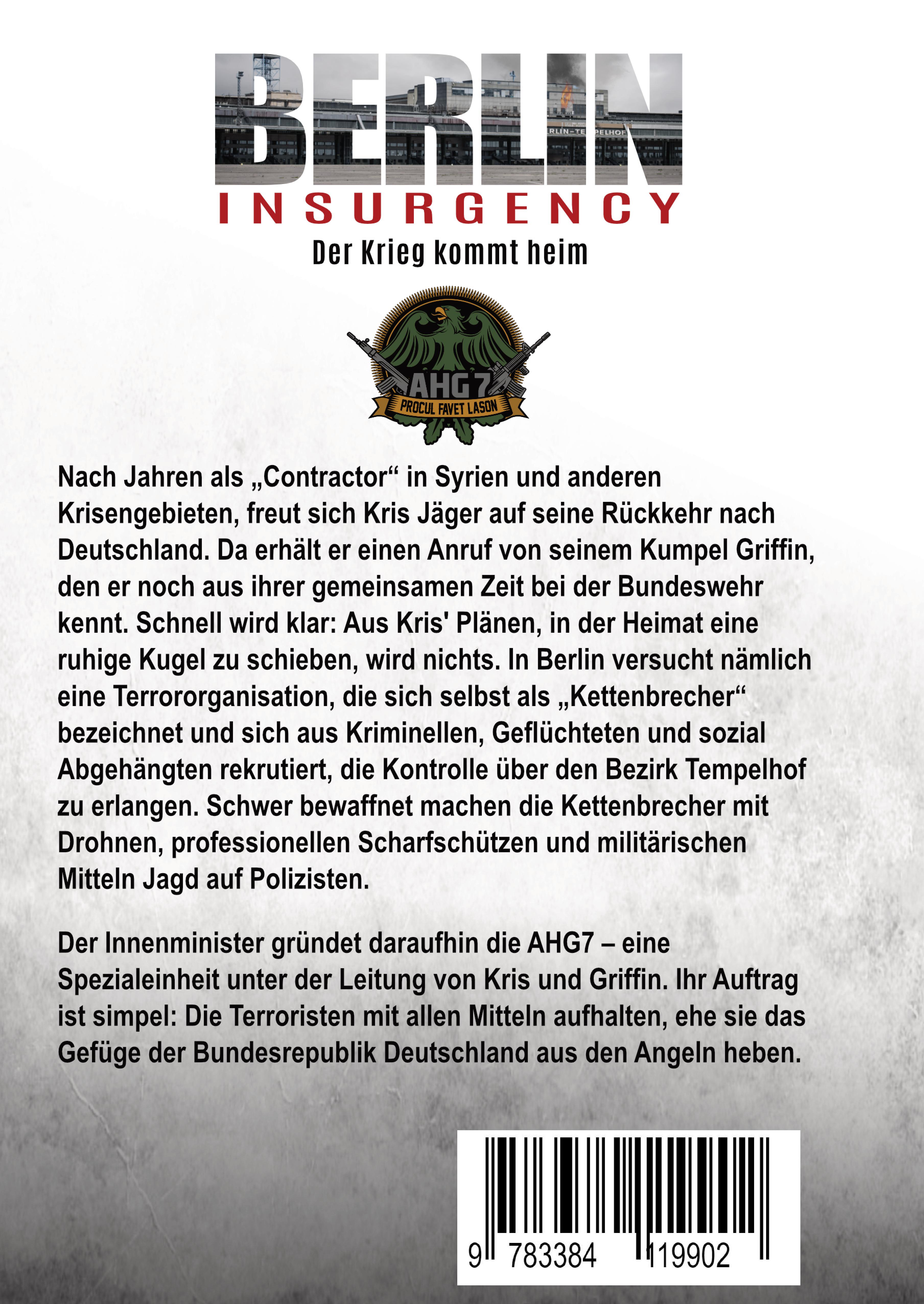 Exzellent recherchiert und erschreckend real - Dieser Thriller entführt Sie in die unsichtbare Welt deutscher Spezialeinheiten!Das Autorenduo C. A. Roberts schuf dank seines Insiderwissens über die Bundeswehr, Polizei und Nachrichtendienste die hyperrealistische Vision einer Bundesrepublik Deutschland am Abgrund. Nur die Veteranen und Scharfschützen Kris Jäger und Griffin MacDonald können noch verhindern, dass eine Terrororganisation die Kontrolle über Teile Berlins an sich reißt ...KLAPPENTEXTNach Jahren als "Contractor" in Syrien und anderen Krisengebieten, freut sich der langjährige Veteran Kris Jäger auf seine Rückkehr nach Deutschland. Da erhält er einen Anruf von seinem Kumpel Griffin, den er noch aus Bundeswehr-Zeiten kennt. Schnell wird klar: Aus Kris' Plänen, in der Heimat eine ruhige Kugel zu schieben, wird nichts.In Berlin versucht nämlich eine Terrororganisation, die sich selbst als "Kettenbrecher" bezeichnet und sich aus Kriminellen, Geflüchteten und sozial Abgehängten rekrutiert, die Kontrolle über den Ortsteil Tempelhof zu erlangen. Schwer bewaffnet machen die Kettenbrecher mit Drohnen, professionellen Scharfschützen und militärischen Mitteln Jagd auf Polizisten.Der Innenminister gründet daraufhin die AHG7 - eine Spezialeinheit unter der Leitung von Kris und Griff. Ihr Auftrag ist simpel: Sie sollen die Terroristen mit allen Mitteln aufhalten, ehe sie das Gefüge der Bundesrepublik Deutschland aus den Angeln heben.ÜBER C. A. ROBERTSHinter dem Pseudonym steckt ein Autorenduo, das als Veteranen der Bundeswehr mit Einsatzerfahrung und Sicherheitsberater im In- und Ausland über atemberaubendes Insiderwissen verfügt. Mit sprachlicher Raffinesse entfalten die beiden eine Geschichte, die einen Aufstand in Deutschland so realistisch darstellt, dass Ihnen die Spucke wegbleiben wird.Dabei rücken die Autoren die Veteranen der Bundeswehr ins Zentrum ihres Action-Thrillers. Sie verarbeiten in ihrem Buch eigene Erlebnisse und setzen den Männern und Frauen, die im Dienste Deutschlands ihr Leben riskiert haben, ein Denkmal. Darüber hinaus würdigt der Roman auch die wichtige Arbeit der Polizei.Der Thriller besticht zudem durch die hervorragenden Kenntnisse der Autoren über Waffentechnik und Einsatztaktiken. Freuen Sie sich auf spannende Einblicke in Vorgehen und Bewaffnung von Spezialeinheiten der Polizei und Bundeswehr und auf nervenzerfetzende Scharfschützenduelle. Tauchen Sie zudem in die verborgene Welt der "Contractor" ein, die weitgehend ohne Wissen der Öffentlichkeit gefährliche Missionen in Kriegs- und Krisenregionen ausführen.Lassen Sie sich diesen außergewöhnlichen Roman nicht entgehen, den die Autoren den Veteranen der Bundeswehr widmen!