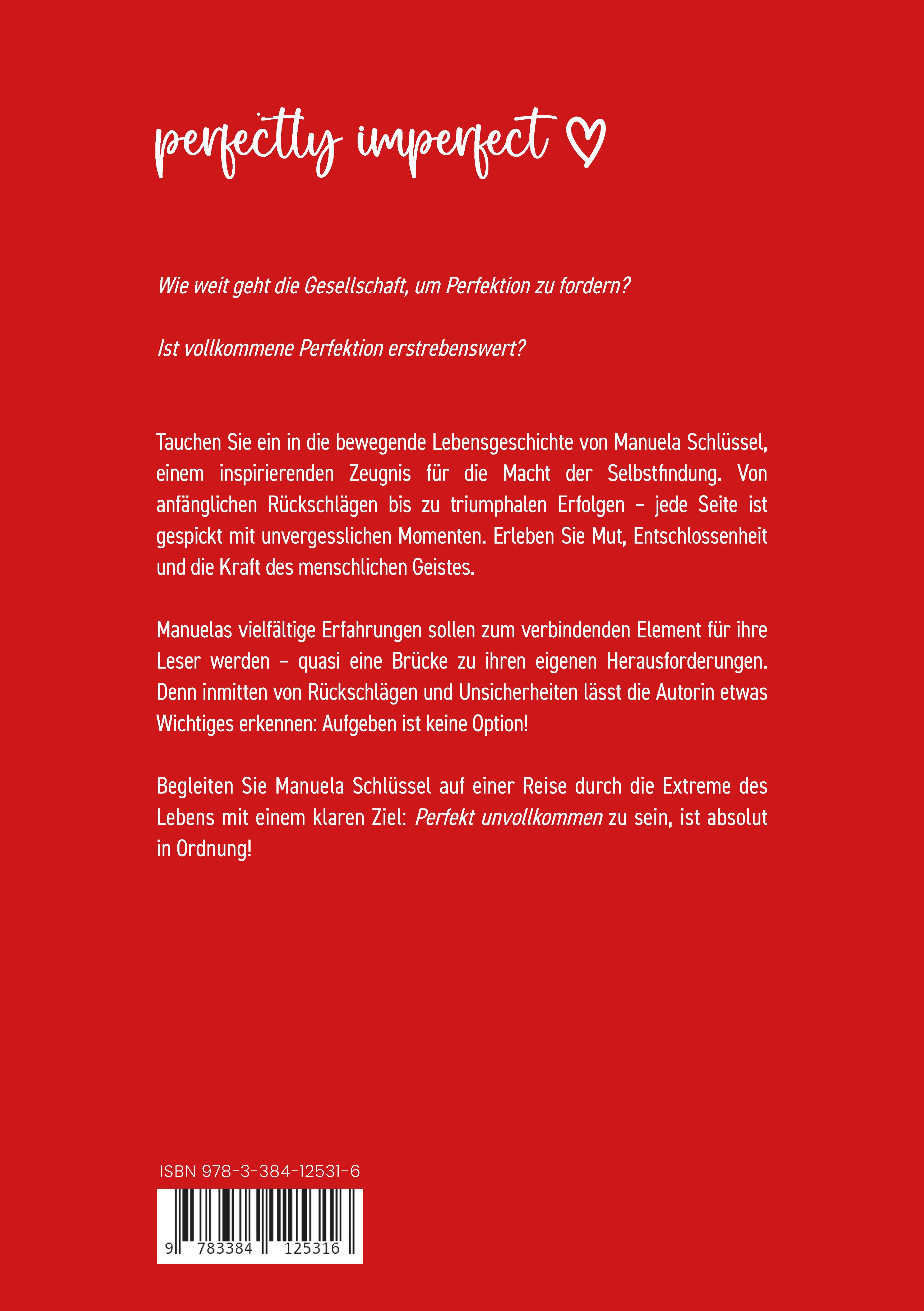 Wie weit geht die Gesellschaft, um Perfektion zu fordern?Ist vollkommene Perfektion erstrebenswert?Tauchen Sie ein in die bewegende Lebensgeschichte von Manuela Schlüssel, einem inspirierenden Zeugnis für die Macht der Selbstfindung. Von anfänglichen Rückschlägen bis zu triumphalen Erfolgen - jede Seite ist gespickt mit unvergesslichen Momenten. Erleben Sie Mut, Entschlossenheit und die Kraft des menschlichen Geistes. Manuelas vielfältige Erfahrungen sollen zum verbindenden Element für ihre Leser werden - quasi eine Brücke zu ihren eigenen Herausforderungen. Denn inmitten von Rückschlägen und Unsicherheiten lässt die Autorin etwas Wichtiges erkennen: Aufgeben ist keine Option!Begleiten Sie Manuela Schlüssel auf einer Reise durch die Extreme des Lebens mit einem klaren Ziel: Perfekt unvollkommen zu sein, ist absolut in Ordnung!