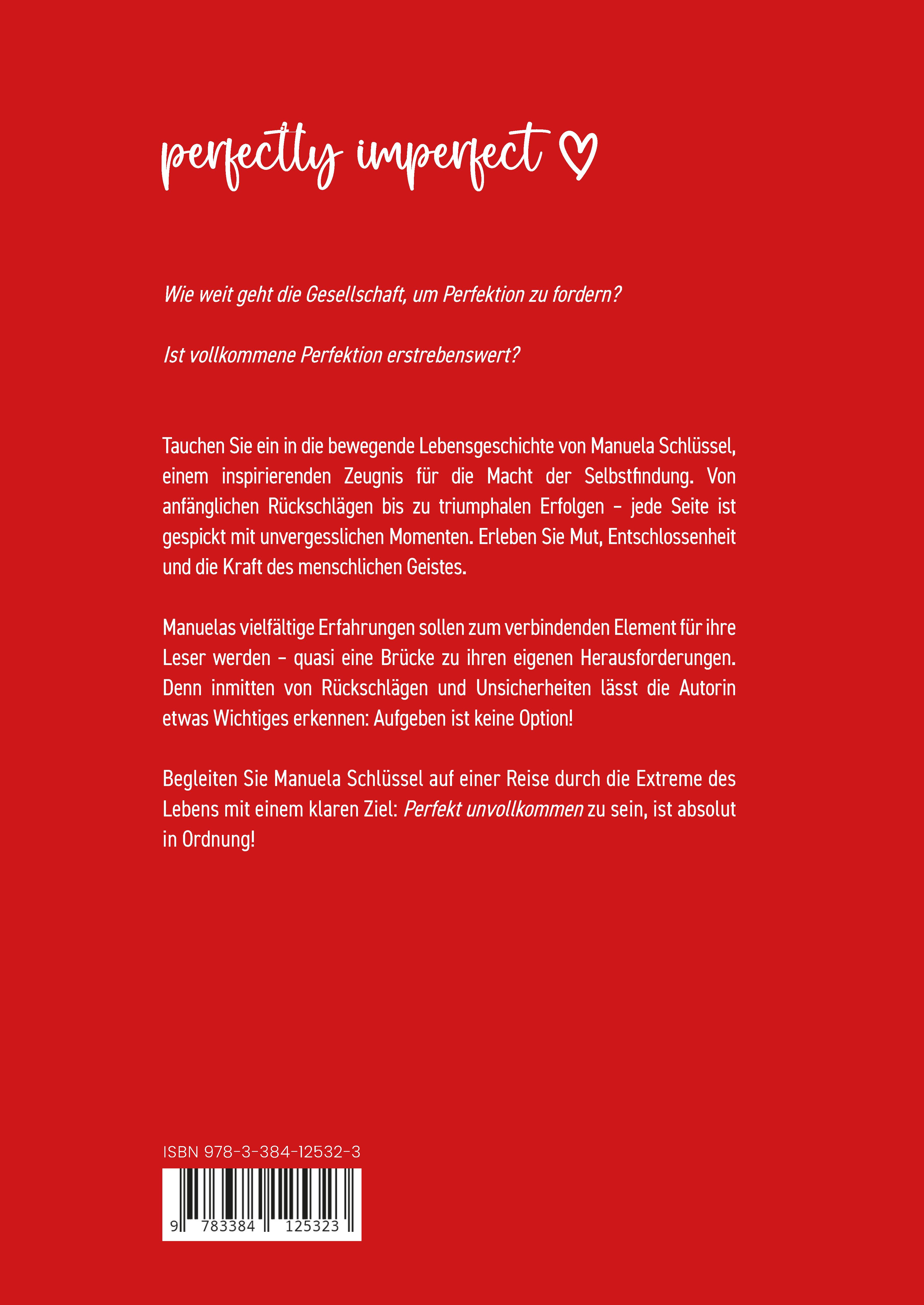 Wie weit geht die Gesellschaft, um Perfektion zu fordern?Ist vollkommene Perfektion erstrebenswert?Tauchen Sie ein in die bewegende Lebensgeschichte von Manuela Schlüssel, einem inspirierenden Zeugnis für die Macht der Selbstfindung. Von anfänglichen Rückschlägen bis zu triumphalen Erfolgen - jede Seite ist gespickt mit unvergesslichen Momenten. Erleben Sie Mut, Entschlossenheit und die Kraft des menschlichen Geistes. Manuelas vielfältige Erfahrungen sollen zum verbindenden Element für ihre Leser werden - quasi eine Brücke zu ihren eigenen Herausforderungen. Denn inmitten von Rückschlägen und Unsicherheiten lässt die Autorin etwas Wichtiges erkennen: Aufgeben ist keine Option!Begleiten Sie Manuela Schlüssel auf einer Reise durch die Extreme des Lebens mit einem klaren Ziel: Perfekt unvollkommen zu sein, ist absolut in Ordnung!