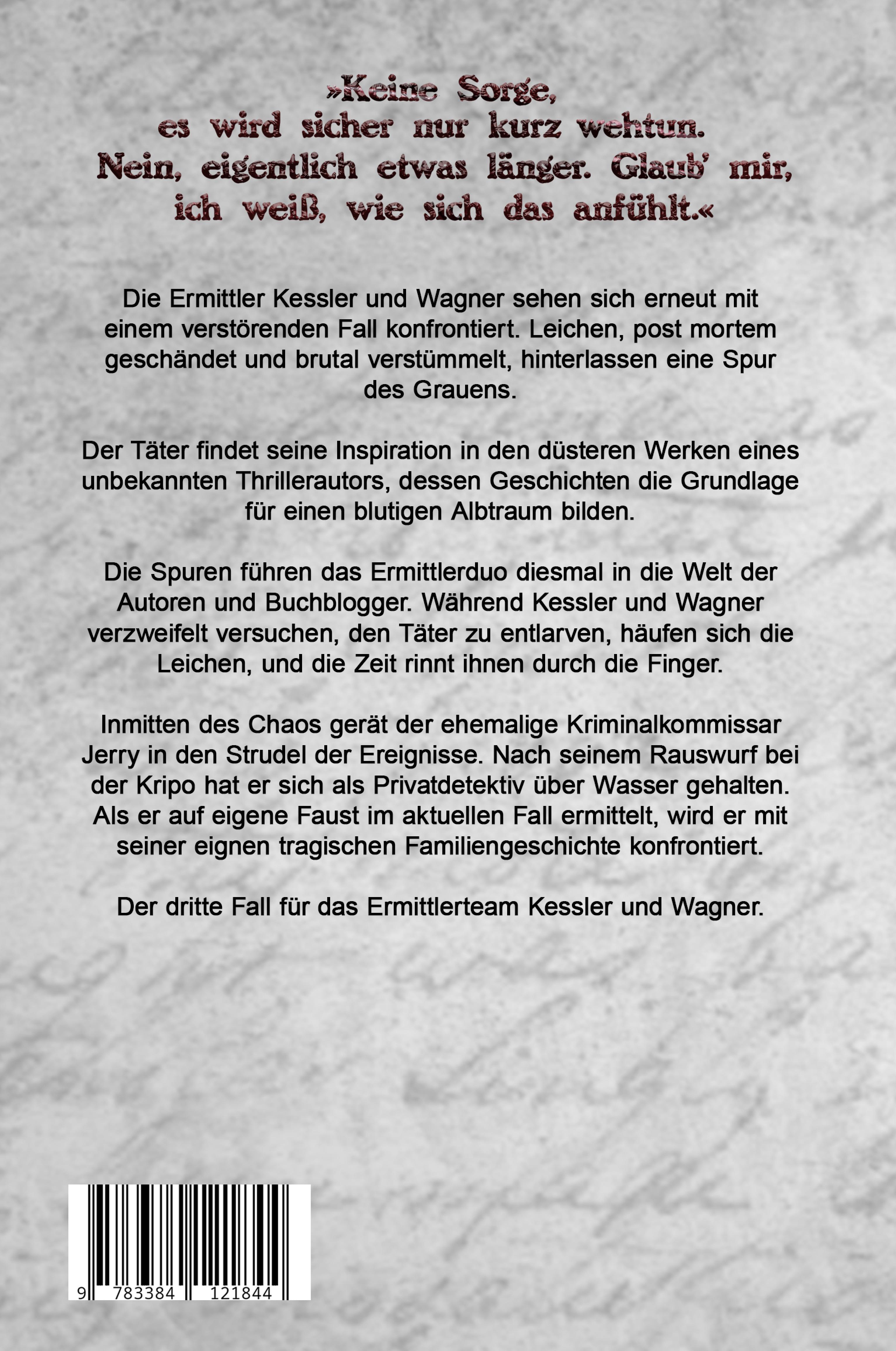 Die Ermittler Kessler und Wagner sehen sich erneut mit einem verstörenden Fall konfrontiert. Leichen, post mortem geschändet und brutal verstümmelt, hinterlassen eine Spur des Grauens. Der Täter findet seine Inspiration in den düsteren Werken eines unbekannten Thrillerautors, dessen Geschichten die Grundlage für einen blutigen Albtraum bilden.Die Spuren führen das Ermittlerduo diesmal in die Welt der Autoren und Buchblogger. Während Kessler und Wagner verzweifelt versuchen, den Täter zu entlarven, häufen sich die Leichen, und die Zeit rinnt ihnen durch die Finger.Inmitten des Chaos gerät der ehemalige Kriminalkommissar Jerry in den Strudel der Ereignisse. Nach seinem Rauswurf bei der Kripo hat er sich als Privatdetektiv über Wasser gehalten. Als er auf eigene Faust im aktuellen Fall ermittelt, wird er mit seiner eignen tragischen Familiengeschichte konfrontiert.Der dritte Fall für das Ermittlerteam Kessler und Wagner.