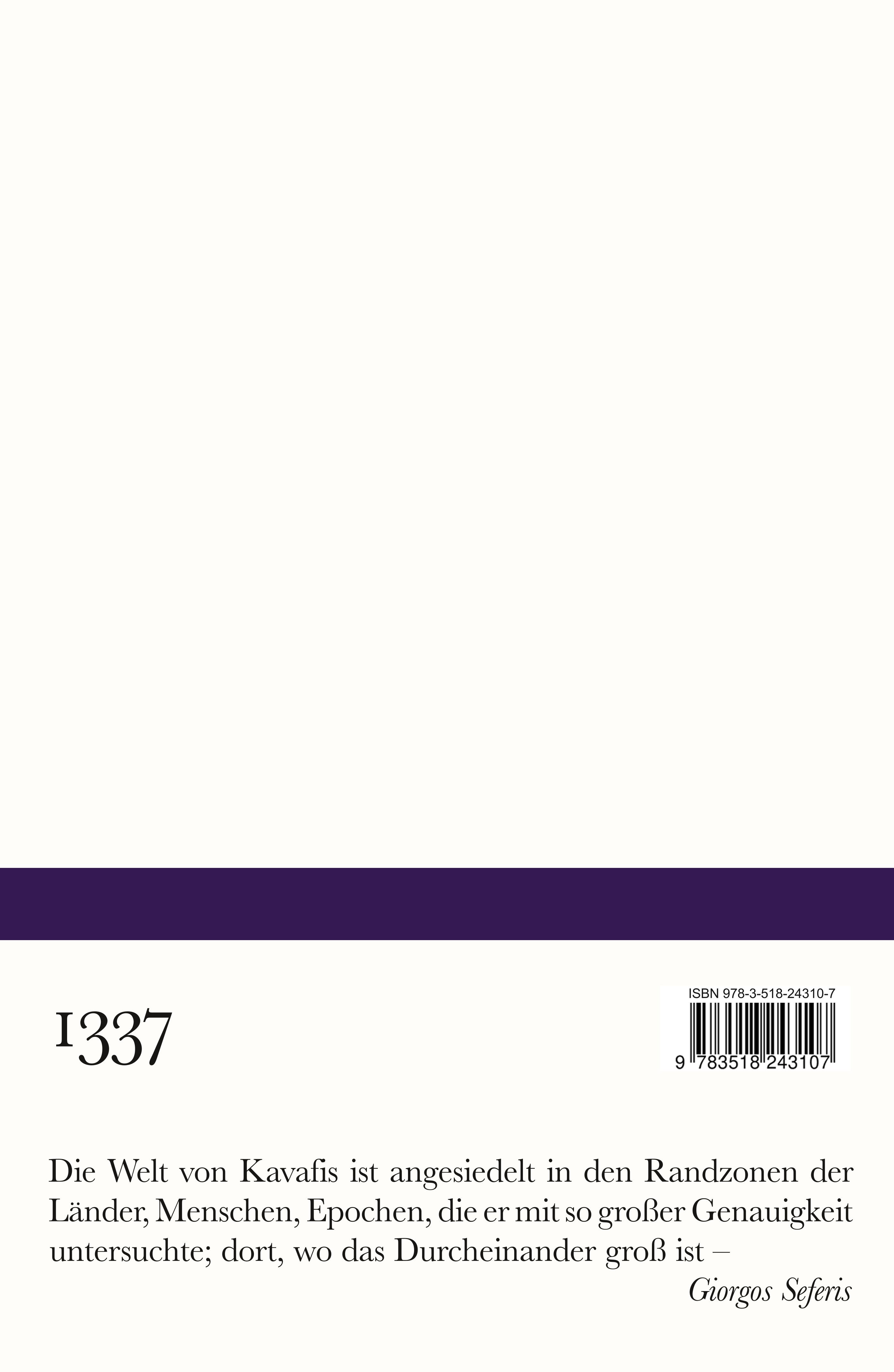 Weil im Zentrum des dichterischen Werks von Konstantinos Kavafis (1863–1933), Begründer der modernen griechische Dichtung, gleichberechtigt neben den Liebesgedichten die historischen Gedichte stehen, tritt neben "Um zu bleiben", den erfolgreichen Band mit Liebeslyrik (BS 1020; Radierungen von David Hockney), eine Auswahl der historischen Gedichte – wiederum in Übertragungen von Michael Schroeder.