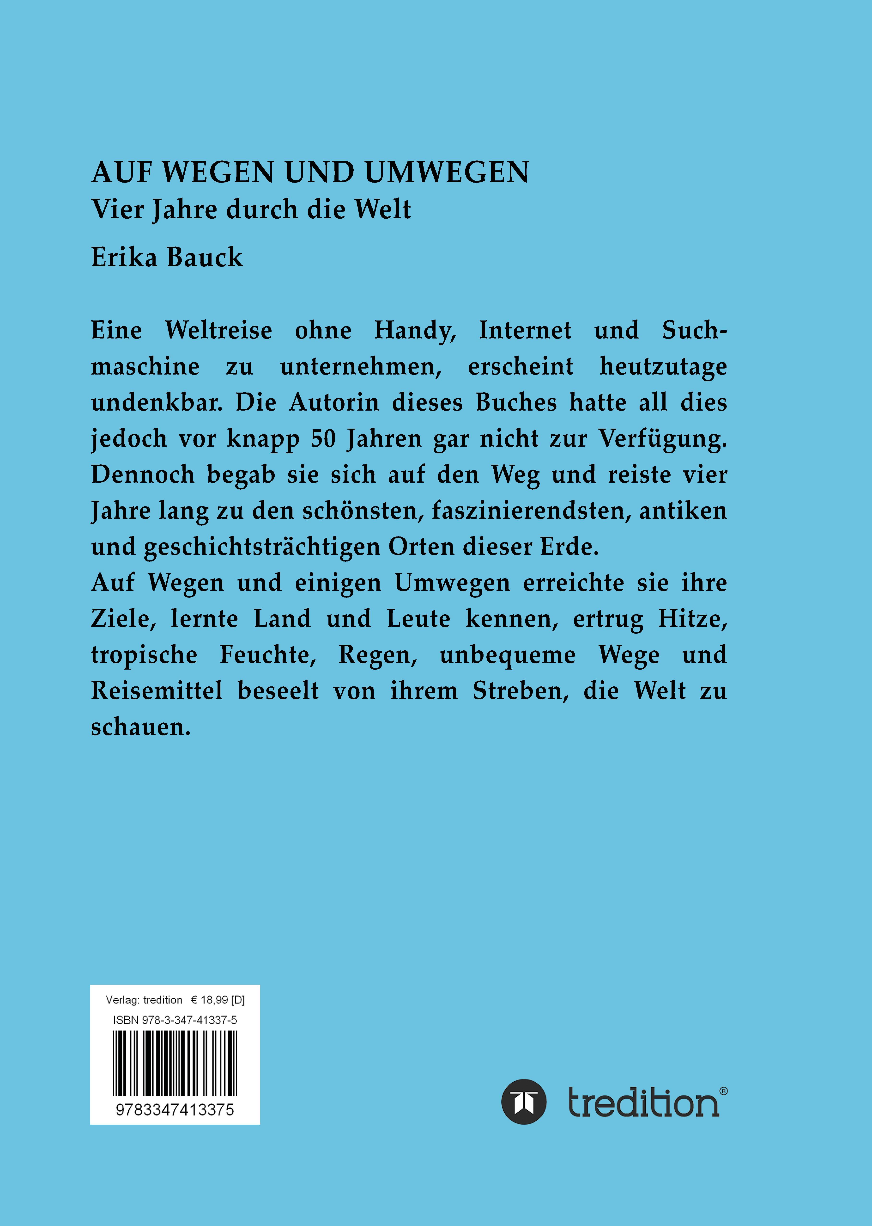 Erika Bauck reiste 4 Jahre lang ohne die heute gewohnten technischen Hilfsmittel um die Welt und berichtet in ihrem Buch anschaulich, authentisch, unterhaltsam, humorvoll und spannend, was in dieser Zeit erlebte.