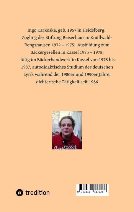 Ingo Karkoska, geb. 1957 in Heidelberg, Zögling des Stiftung Beiserhaus in Knüllwald-Rengshausen 1972 – 1975, Ausbildung zum Bäckergesellen in Kassel 1975 – 1978, tätig im Bäckerhandwerk in Kassel von 1978 bis 1987, autodidaktisches Studium der deutschen Lyrik während der 1980er und 1990er Jahre, dichterische Tätigkeit seit 1986.