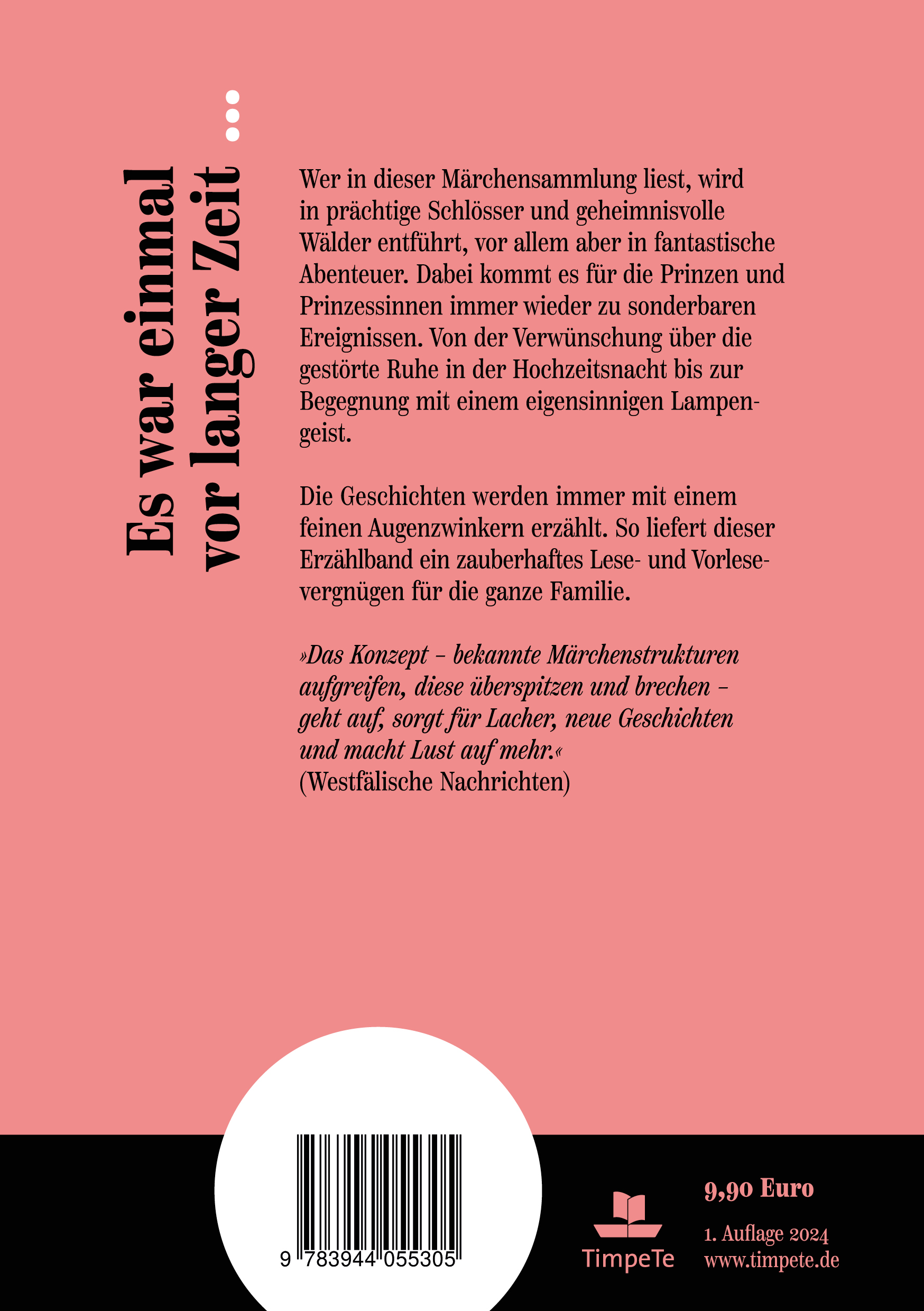 Wer in dieser Märchensammlung liest, wird in prächtige Schlösser und geheimnisvolle Wälder entführt, vor allem aber in fantastische Abenteuer. Dabei kommt es für die Prinzen und Prinzessinnen immer wieder zu sonderbaren Ereignissen. Von der Verwünschung über die gestörte Ruhe in der Hochzeitsnacht bis zur Begegnung mit einem eigensinnigen Lampengeist. Die Geschichten werden immer mit einem feinen Augenzwinkern erzählt. So liefert dieser Erzählband ein zauberhaftes Lese- und Vorlesevergnügen für die ganze Familie.