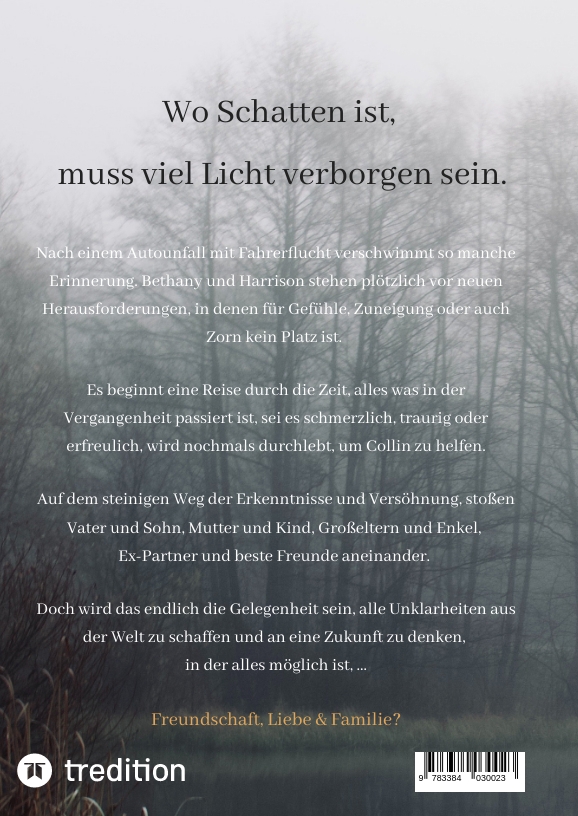 Band 3: SchattenbilderNach einem Autounfall mit Fahrerflucht verschwimmt so manche Erinnerung. Bethany und Harrison stehen plötzlich vor neuen Herausforderungen, in denen für Gefühle, Zuneigung oder auch Zorn kein Platz ist. Es beginnt eine Reise durch die Zeit, alles was in der Vergangenheit passiert ist, sei es schmerzlich, traurig oder erfreulich, wird nochmals durchlebt, um Collin zu helfen.Auf dem steinigen Weg der Erkenntnisse und Versöhnung, stoßen Vater und Sohn, Mutter und Kind, Großeltern und Enkel, Ex-Partner und beste Freunde aneinander. Doch wird das endlich die Gelegenheit sein, alle Unklarheiten aus der Welt zu schaffen und an eine Zukunft zu denken, in der alles möglich ist, ...Freundschaft, Liebe & Familie?