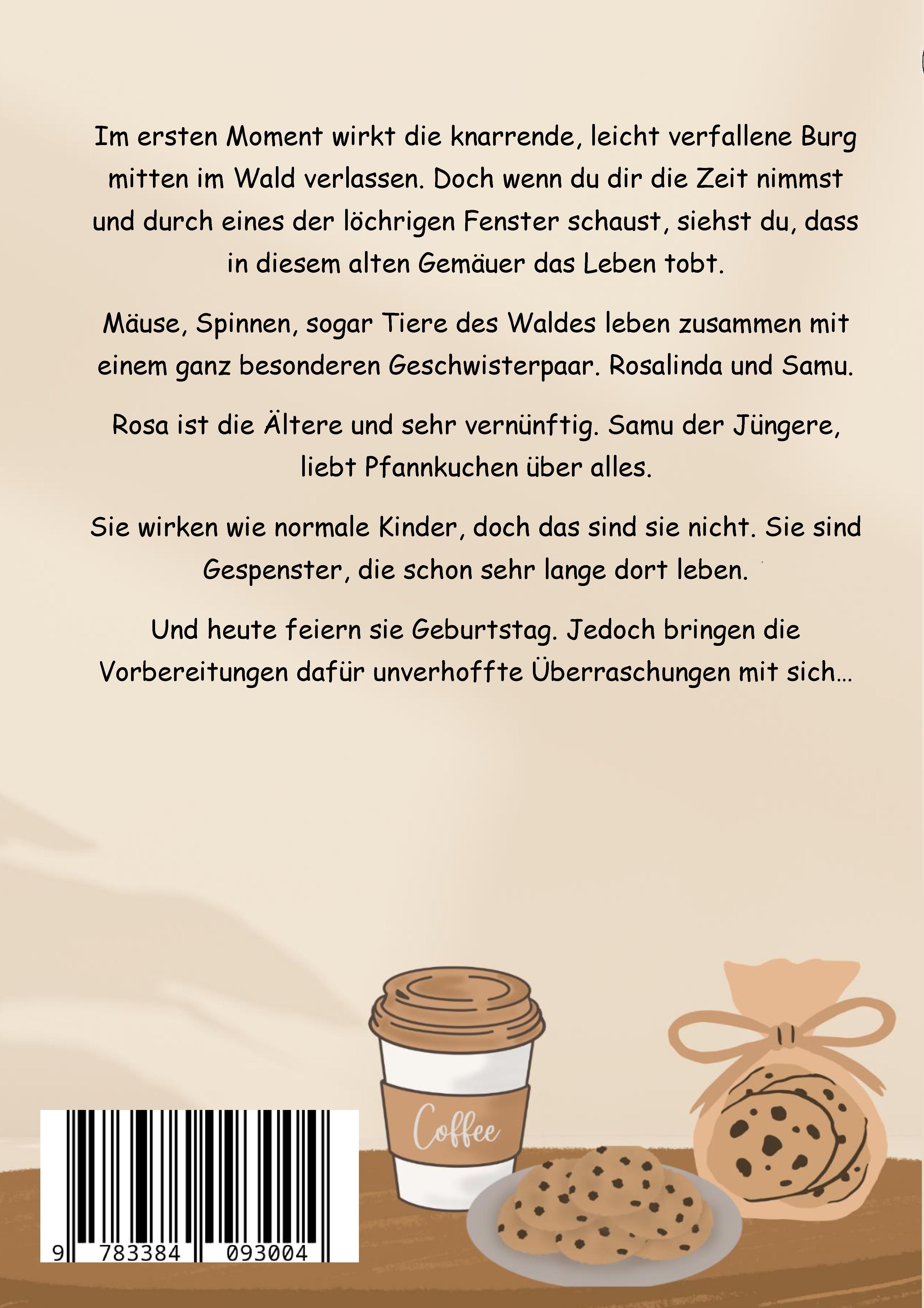 | Schlagworte | Angst • Antwort • Augen • Bett • Blick • Burg • Danke • Dorf • Eier • Eierkuchen • Eindringling • Essen • Familie • Fee • Feier • Fest • finden • Fledermaus • Fragen • Freunde • Freundschaft • Geburtstag • Gedanken • Geist • Geschwister • Gesicht • Gespenster • Hirsch • Jahren • Käfer • Kekse • Kinder • Mäuse • Moment • Nacht • Paar • Schloß • schokokekse • Schokolade • Spinne • Tiere • Tisch • Vogel • Wald • Zeit • Zimmer |