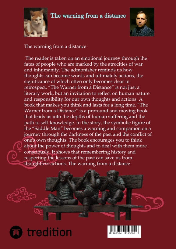 "The Warner from a Distance" is a profound and moving book that takes the reader into the depths of human suffering and the path to self-knowledge. The symbolic figure of the "Saddle Man" becomes a warning and accompaniment on a journey through the darkness of the past and the conflict of one's own thoughts.The plot takes the reader through the fates of people affected by the atrocities of war and inhumanity. The Warner reminds us how thoughts become words and ultimately actions, the consequences of which often only become clear in retrospect.The book encourages you to think about the power of thoughts and to deal with them more consciously. It shows that remembering history and paying attention to the lessons of the past can save us from thoughtless actions.Overall, "The Warner from a Distance" is not just a literary work, but an invitation to reflect on human nature and responsibility for our own thoughts and actions. It is a book that makes you think and lasts for a long time.