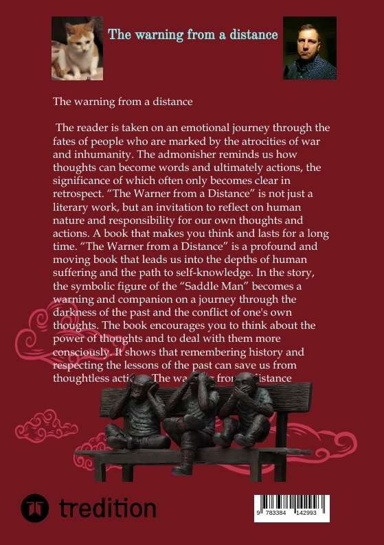 "The Warner from a Distance" is a profound and moving book that takes the reader into the depths of human suffering and the path to self-knowledge. The symbolic figure of the "Saddle Man" becomes a warning and accompaniment on a journey through the darkness of the past and the conflict of one's own thoughts.The plot takes the reader through the fates of people affected by the atrocities of war and inhumanity. The Warner reminds us how thoughts become words and ultimately actions, the consequences of which often only become clear in retrospect.The book encourages you to think about the power of thoughts and to deal with them more consciously. It shows that remembering history and paying attention to the lessons of the past can save us from thoughtless actions.Overall, "The Warner from a Distance" is not just a literary work, but an invitation to reflect on human nature and responsibility for our own thoughts and actions. It is a book that makes you think and lasts for a long time.