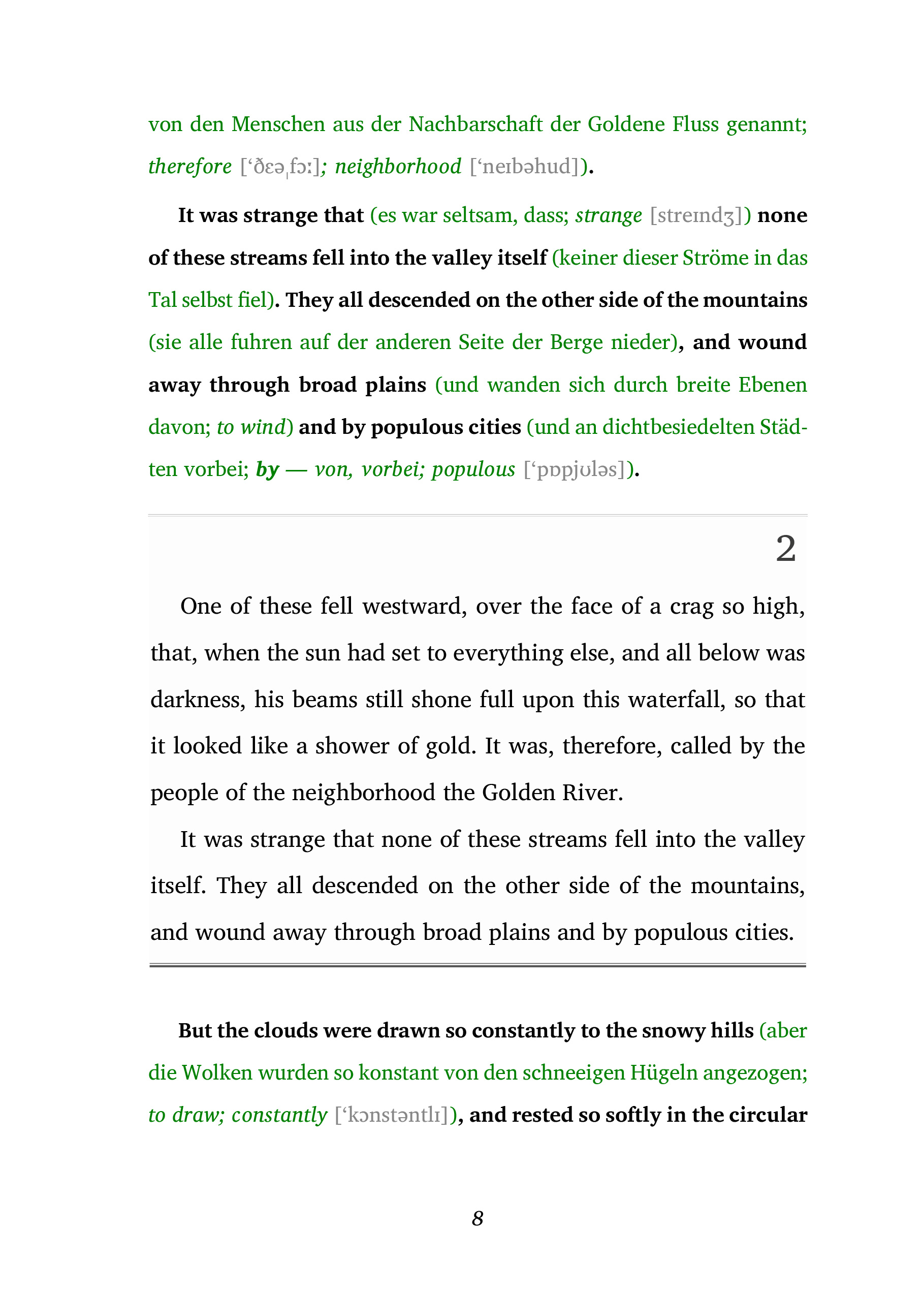 Entdecken Sie die Welt der Fremdsprachen auf eine ganz neue Weise mit der Lesemethode von Ilya Frank, perfekt für alle ab dem Sprachniveau A2. Diese innovative Methode kombiniert Originaltexte mit klaren, direkten Übersetzungen und bietet zusätzliche Erläuterungen direkt im Lesefluss, um ein tiefes Verständnis und schnelles Lernen zu fördern. Ob Sie Ihre Sprachkenntnisse verbessern oder in eine neue Sprache eintauchen möchten, diese Methode bietet ein einzigartiges und effektives Leseerlebnis. Dank der integrierten Hörbücher wird auch das Hörverständnis trainiert.Lesemethode von Ilya Frank ist ideal für alle, die ihre Sprachkenntnisse effektiv erweitern wollen, ohne den natürlichen Lesefluss zu unterbrechen.Entdecken Sie die magische Erzählung von "The King of the Golden River", eine Geschichte, die von den Abenteuern dreier ungleicher Brüder erzählt, die versuchen, das Geheimnis eines mythischen Flusses zu lüften, der in Gold verwandelt werden kann. In dieser fesselnden Geschichte, die in der malerischen Landschaft von Stiria spielt, lernen die Brüder Schwartz, Hans und der gutmütige Gluck auf ihrer Reise zum Goldenen Fluss wichtige Lektionen über Gier, Güte und die wahre Bedeutung von Reichtum.Als die beiden älteren Brüder, getrieben von Habgier, ihr Glück versuchen und scheitern, ist es der junge Gluck, dessen reines Herz und selbstlose Taten den Schlüssel zum Erfolg darstellen. Diese zeitlose Erzählung, voller magischer Begegnungen und mystischer Wendungen, ist nicht nur ein spannendes Abenteuer, sondern auch eine tiefgreifende Reflexion über die Macht der Menschlichkeit und der Natur.Tauchen Sie ein in "The King of the Golden River" und lassen Sie sich von einer Geschichte verzaubern, die zeigt, wie wahre Güte und Mitgefühl den größten Schatz von allen enthüllen können.Ungekürzter Originaltext. Zweisprachiges Buch Englisch-Deutsch.Innovative Lesemethode von Ilya Frank: https://easyoriginal.com/lesemethode/