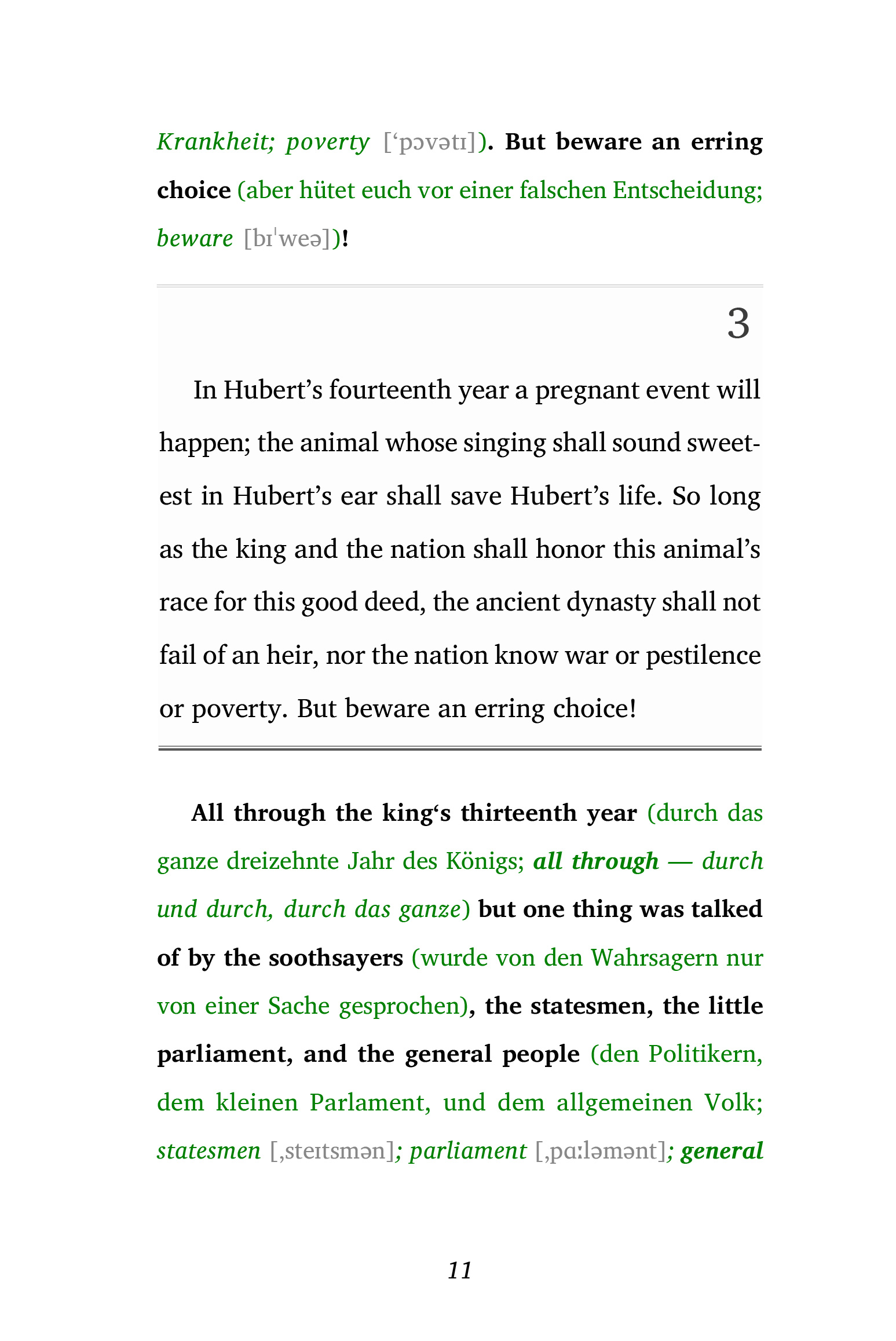 Entdecken Sie die Welt der Fremdsprachen auf eine ganz neue Weise mit der Lesemethode von Ilya Frank, perfekt für alle ab dem Sprachniveau A2. Diese innovative Methode kombiniert Originaltexte mit klaren, direkten Übersetzungen und bietet zusätzliche Erläuterungen direkt im Lesefluss, um ein tiefes Verständnis und schnelles Lernen zu fördern. Ob Sie Ihre Sprachkenntnisse verbessern oder in eine neue Sprache eintauchen möchten, diese Methode bietet ein einzigartiges und effektives Leseerlebnis. Dank der integrierten Hörbücher wird auch das Hörverständnis trainiert.Lesemethode von Ilya Frank ist ideal für alle, die ihre Sprachkenntnisse effektiv erweitern wollen, ohne den natürlichen Lesefluss zu unterbrechen.Entdecken Sie die zeitlose Magie und den Charme von "Legend of Sagenfeld, in Germany", einem entzückenden Meisterwerk, das Sie in eine Welt voller Wunder und Weisheit entführt. In diesem kleinen, von den Turbulenzen der Geschichte unberührten Königreich, wo die Zeit stillzustehen scheint, beginnt die Geschichte mit dem einfachen Leben und den unschuldigen Menschen von Sagenfeld. Als der junge König Hubert den Thron besteigt, wird sein Reich von einer Prophezeiung überschattet, die das Schicksal des Königreichs an die Wahl des süßesten Sängers im Tierreich knüpft.Mit einer Mischung aus Spannung und Zärtlichkeit entfaltet sich die Erzählung, als König Hubert vor die Herausforderung gestellt wird, zwischen den betörenden Melodien der Vögel und der unerwarteten, herzlichen Stimme eines einfachen Esels zu wählen. Diese Wahl birgt das Geheimnis des Überlebens und Wohlstands seines Reiches. "Legend of Sagenfeld, in Germany" ist nicht nur eine Geschichte über die Macht der Musik und die Unschuld der Natur, sondern auch ein tiefgründiges Werk über die Erkenntnis, dass wahre Weisheit oft in den bescheidensten Gestalten zu finden ist.Tauchen Sie ein in eine Erzählung, die mit ihrer Einfachheit verzaubert und gleichzeitig tiefgründige Wahrheiten über Führung, Glauben und die unerwartete Bedeutung der kleinsten Kreaturen in unserem Leben offenbart. Dieses Buch ist eine Hommage an die Kraft der Demut und die unerwartete Weisheit, die oft in den leisesten Stimmen zu finden ist. Es ist ein Muss für jeden, der sich nach einer Geschichte sehnt, die das Herz erwärmt und gleichzeitig zum Nachdenken anregt.Ungekürzter Originaltext. Zweisprachiges Buch Englisch-Deutsch.Innovative Lesemethode von Ilya Frank: https://easyoriginal.com/lesemethode/