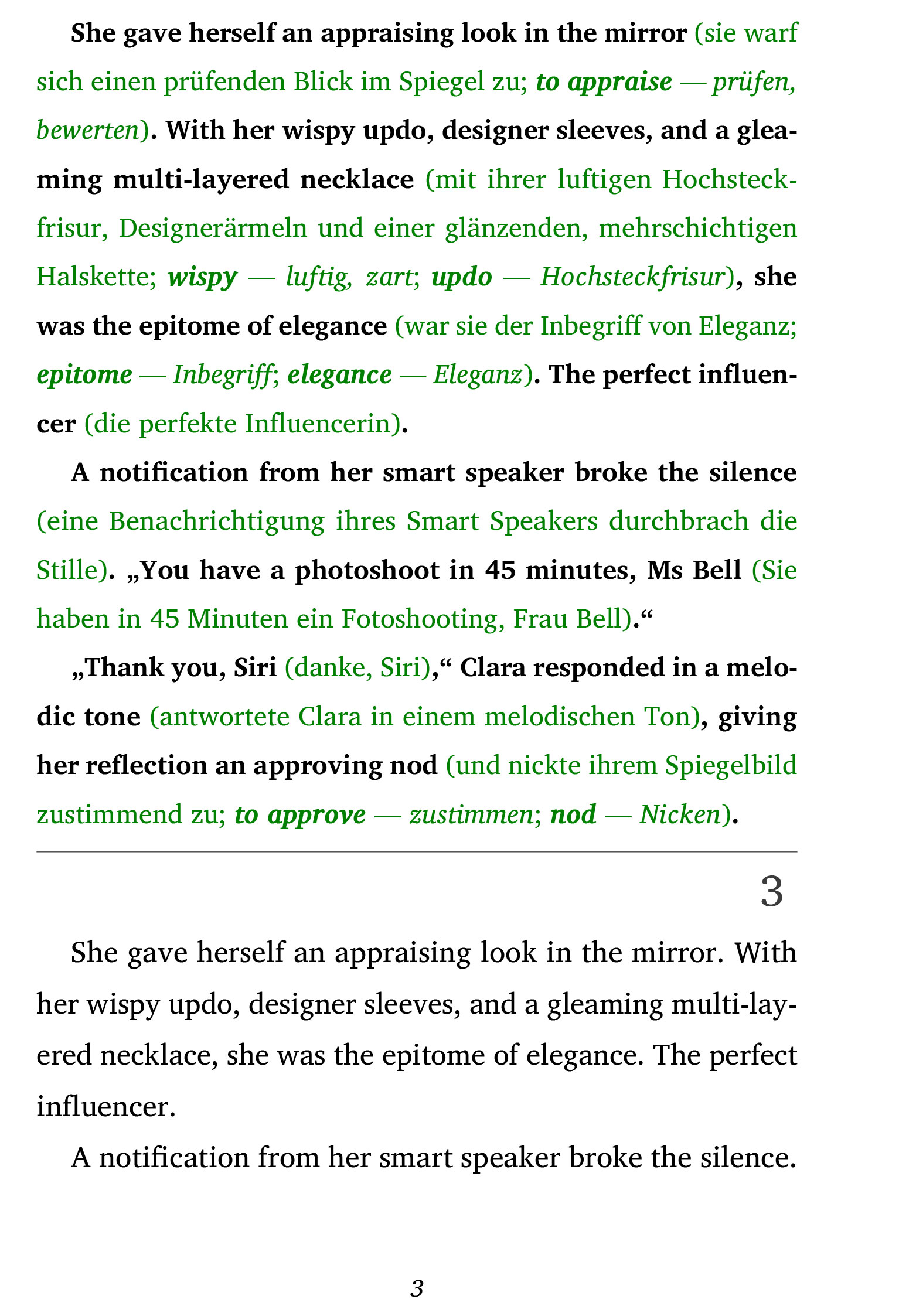 Entdecken Sie die Welt der Fremdsprachen auf eine ganz neue Weise mit der Lesemethode von Ilya Frank, perfekt für alle ab dem Sprachniveau A2. Diese innovative Methode kombiniert Originaltexte mit klaren, direkten Übersetzungen und bietet zusätzliche Erläuterungen direkt im Lesefluss, um ein tiefes Verständnis und schnelles Lernen zu fördern. Ob Sie Ihre Sprachkenntnisse verbessern oder in eine neue Sprache eintauchen möchten, diese Methode bietet ein einzigartiges und effektives Leseerlebnis. Dank der integrierten Hörbücher wird auch das Hörverständnis trainiert.Lesemethode von Ilya Frank ist ideal für alle, die ihre Sprachkenntnisse effektiv erweitern wollen, ohne den natürlichen Lesefluss zu unterbrechen.Entdecken Sie "The Influencer's Predicament", eine fesselnde Geschichte, die Clara Bell, eine glamouröse Influencerin, in den Mittelpunkt stellt. Claras Leben auf der schillernden Online-Plattform ChicSite ist ein Wirbelwind aus Eleganz und stilvollen Abenteuern, bis ihr ungewöhnlicher Co-Star, der pfiffige Papagei Mr. Tweets, für unerwartete Wendungen sorgt. Dieser charmante Federfreund stürzt Clara in eine Reihe von komischen, doch herzerwärmenden Situationen, die sie dazu bringen, die Bedeutung von Authentizität und die Kraft der wahren Selbstakzeptanz zu entdecken. Treten Sie ein in eine Welt, in der die glitzernde Fassade der Perfektion auf die unvorhersehbaren Freuden des echten Lebens trifft, und lassen Sie sich von Claras Reise zu sich selbst inspirieren.Ungekürzter Originaltext. Zweisprachiges Buch Englisch-Deutsch.Innovative Lesemethode von Ilya Frank: https://easyoriginal.com/lesemethode/