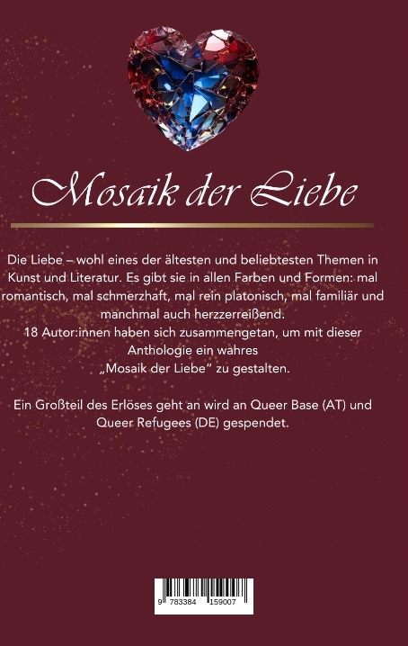 "Mosaik der Liebe" zelebriert Liebe in allen Formen und Farben: romantisch, platonisch, familiär, die Liebe zum Haustier und die Liebe zum Sternenkind. Mal amüsant, mal traurig, mal ganz klassisch und auch mal toxisch. Die Autor:innen gestalten zusammen ein wahres Mosaik an verschiedenen Geschichten.