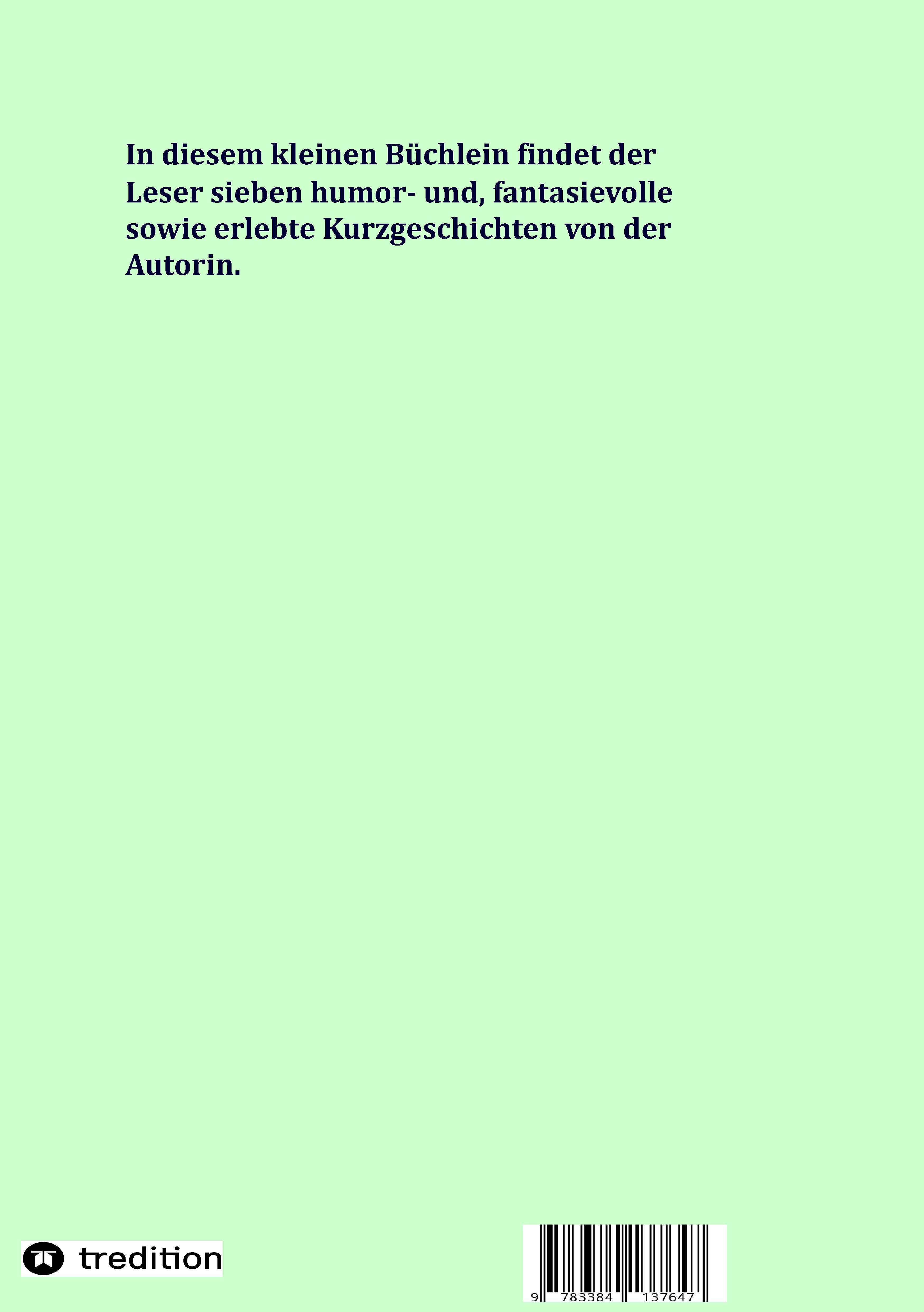 Wer ein Liebhaber von kleinen humor- und fantasievollen Kurzgeschichten ist, wird dieses Büchlein lieben. Einige von ihnen hat die Schriftstellerin persönlich erlebt unddiese in dem ihr eigenen Stil niedergeschrieben.Welche das sind wird dem Leser nicht verraten. Vielleicht findeter es sogar selbst heraus.