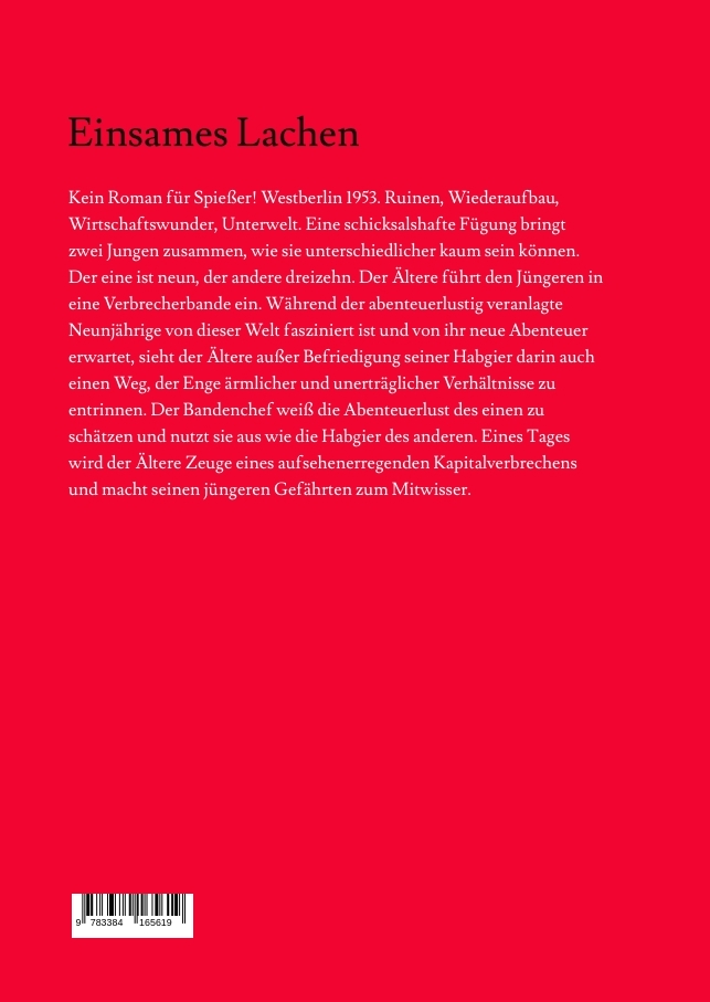 Kein Roman für Spießer! Westberlin 1953. Ruinen, Wiederaufbau, Wirtschaftswunder, Unterwelt. Eine schicksalshafte Fügung bringt zwei Jungen zusammen, wie sie unterschiedlicher kaum sein können. Der eine ist neun, der andere dreizehn. Der Ältere führt den Jüngeren in eine Verbrecherbande ein. Während der abenteuerlustig veranlagte Neunjährige von dieser Welt fasziniert ist und von ihr neue Abenteuer erwartet, sieht der Ältere außer Befriedigung seiner Habgier darin auch einen Weg, der Enge ärmlicher und unerträglicher Verhältnisse zu entrinnen. Der Bandenchef weiß die Abenteuerlust des einen zu schätzen und nutzt sie aus wie die Habgier des anderen. Eines Tages wird der Ältere Zeuge eines aufsehenerregenden Kapitalverbrechens und macht seinen jüngeren Gefährten zum Mitwisser.