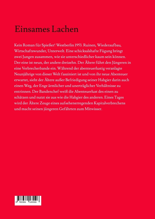 Kein Roman für Spießer! Westberlin 1953. Ruinen, Wiederaufbau, Wirtschaftswunder, Unterwelt. Eine schicksalshafte Fügung bringt zwei Jungen zusammen, wie sie unterschiedlicher kaum sein können. Der eine ist neun, der andere dreizehn. Der Ältere führt den Jüngeren in eine Verbrecherbande ein. Während der abenteuerlustig veranlagte Neunjährige von dieser Welt fasziniert ist und von ihr neue Abenteuer erwartet, sieht der Ältere außer Befriedigung seiner Habgier darin auch einen Weg, der Enge ärmlicher und unerträglicher Verhältnisse zu entrinnen. Der Bandenchef weiß die Abenteuerlust des einen zu schätzen und nutzt sie aus wie die Habgier des anderen. Eines Tages wird der Ältere Zeuge eines aufsehenerregenden Kapitalverbrechens und macht seinen jüngeren Gefährten zum Mitwisser.