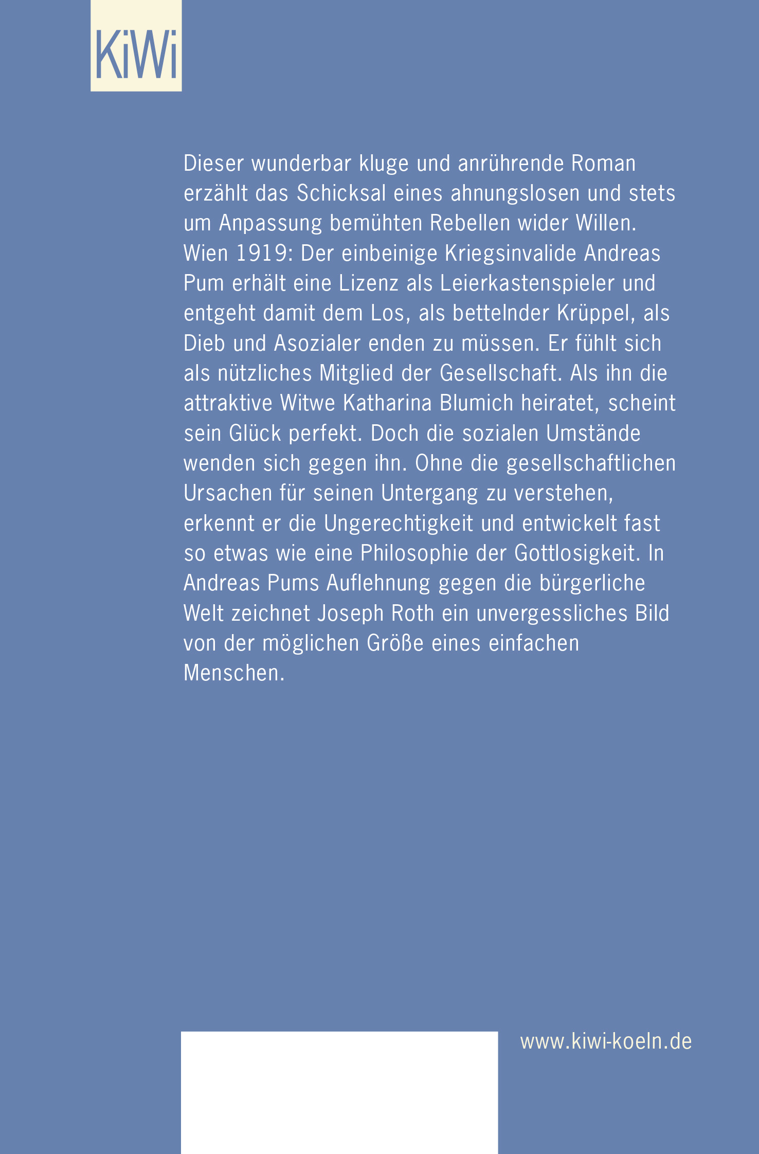 Joseph Roths Roman vom Scheitern eines Rebellen gegen die UngerechtigkeitJoseph Roths kluge, melancholische Geschichte über die verzweifelte Auflehnung eines um Anpassung gegen die bürgerliche Welt bemühten einfachen Mannes zeugt von der Zeitlosigkeit und existenziellen Kraft seines Erzählens. Wien 1919: Der einbeinige Kriegsinvalide Andreas Pum erhält eine Lizenz als Leierkastenspieler und entgeht damit dem Schicksal, als bettelnder Krüppel, als Dieb und Asozialer enden zu müssen. Er fühlt sich als nützliches Mitglied der Gesellschaft und schafft es sogar, die attraktive Witwe Katharina Blumich für sich einzunehmen. Als sie ihn heiratet, scheint Andreas Pums Glück perfekt. Aber sowenig Pum die Zusammenhänge durchschaut, die aus ihm einen ordentlichen Bürger machen, sowenig begreift er, was geschieht, als die sozialen Umstände sich durch eine Laune des Schicksals gegen ihn wenden und seinen Untergang herbeiführen. Ohne die gesellschaftlichen Ursachen für seine Lage zu verstehen, erkennt Pum doch die Ungerechtigkeit der Welt und entwickelt in der eindrucksvollen Schlussapotheose fast so etwas wie eine Philosophie der Gottverlassenheit.