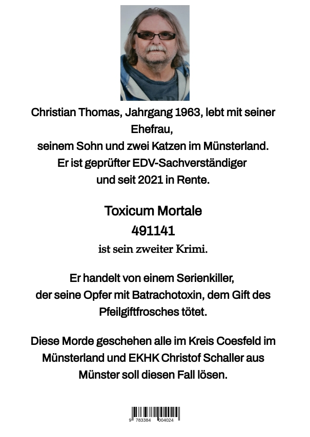 Christian Thomas wurde 1963 in Hannoversch Münden in Niedersachsen geboren und wuchs im Siegerland auf. Er ist gelernter IT-Systemelektroniker und EDV-Sachverständiger. Christian Thomas wohnt in Coesfeld im Münsterland. Er ist verheiratet und hat 2 Kinder und 2 Enkelkinder. Seit 2021 befindet er sich in Frührente und fing 2022 an, Bücher zu schreiben. Sein erstes Buch „… wir haben ihn nie gewollt! Die Lebensgeschichte eines Adoptivkindes“ kam im Mai 2023 heraus. Es beschreibt seine eigene Kindheit und Jugend. Ein Muss für jeden, der die dunklere Seite von Adoption kennenlernen möchte! Nicht immer führt eine Adoption bei einem Kind zu einem besseren Leben. Das Buch „Kriminalhauptkommissar Geiger, Ein Hauch von Vanille“ ist das erste einer Reihe von Krimis mit Kriminalhauptkommissar Manfred Geiger, Leiter einer Sonderkommission (SoKo) bei der Kriminalpolizei Frankfurt. Die SoKo muss den Mord an einer weltbekannten Influencerin aufklären! Nicht immer ist alles so, wie es scheint! Dieses Buch ist am 01.12.2023 erschienen. Sein zweiter Krimi "Toxicum Mortale, 491141" wird im März 2024 veröffentlicht und handelt von Giftmorden im Kreis Coesfeld. Erster Kriminalhauptkommissar Christof Schaller und seine SoKo soll diese Morde aufklären. Mit Hilfe seiner beiden Kollegen, der KTU und dem Gerichtsmedizinischen Institut kommen sie der Lösung langsam aber sicher näher! Aber es ist wie die Suche nach der Nadel im Heuhaufen!