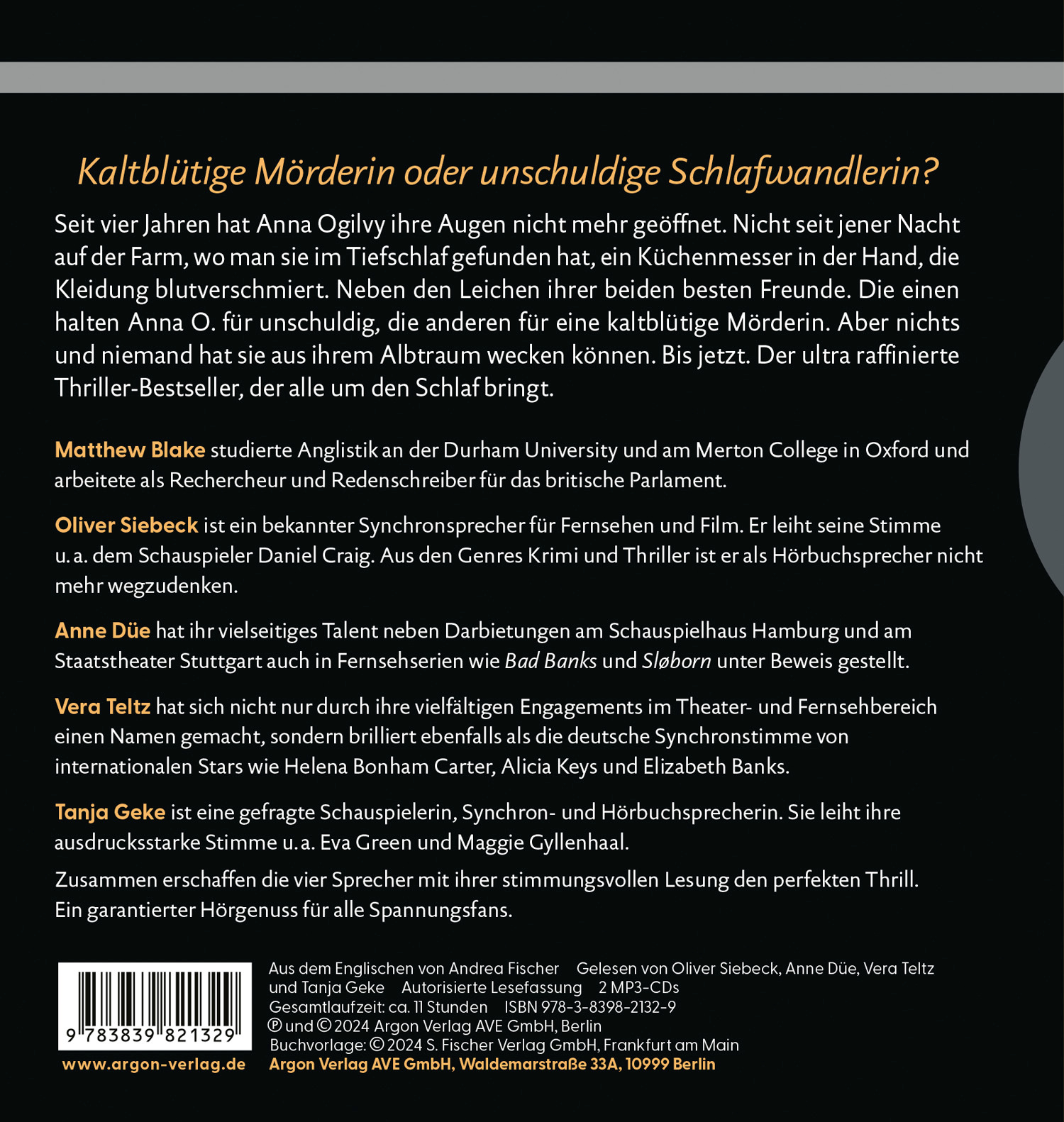 Seit vier Jahren hat Anna Ogilvy ihre Augen nicht mehr geöffnet. Nicht seit jener Nacht auf der Farm, wo man sie im Tiefschlaf gefunden hat, ein Küchenmesser in der Hand, die Kleidung blutverschmiert. Neben den Leichen ihrer beiden besten Freunde. Die einen halten Anna O. für unschuldig, die anderen für eine kaltblütige Mörderin. Aber nichts und niemand hat sie aus ihrem Albtraum wecken können. Bis jetzt.