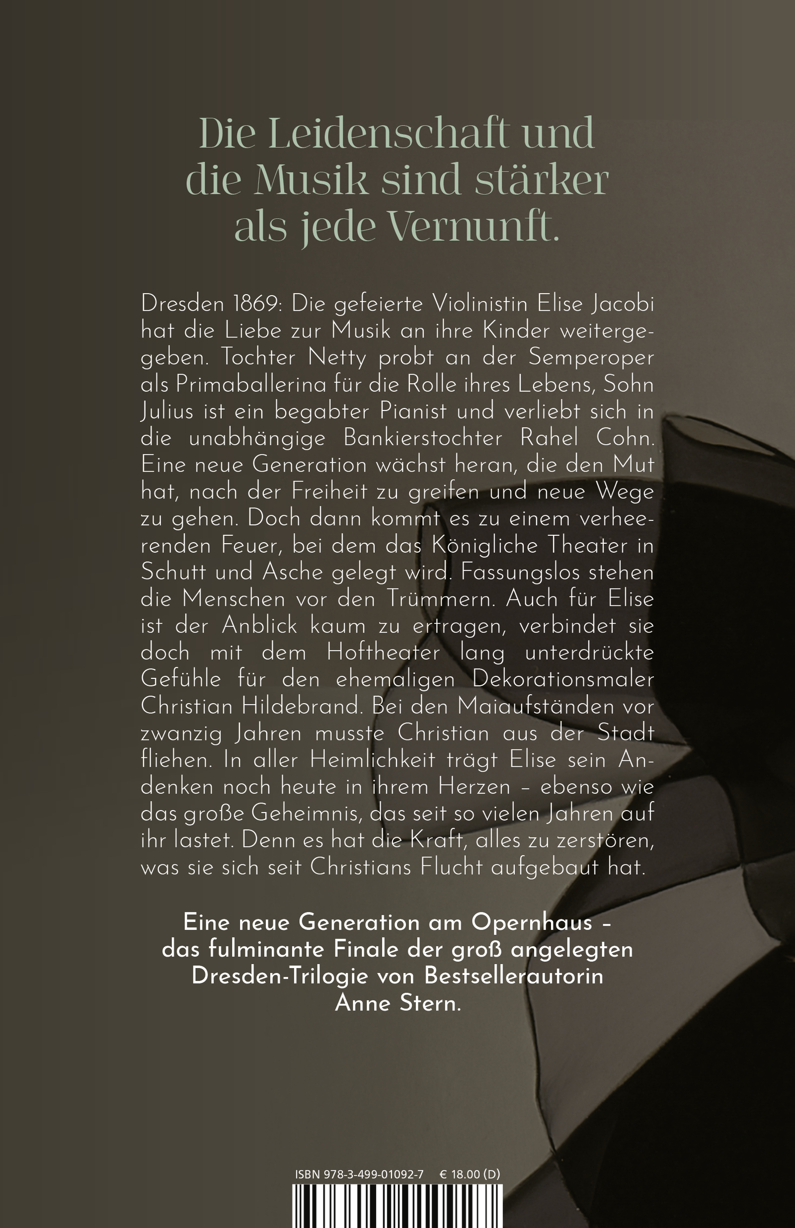 Dresden 1869: Die gefeierte Violinistin Elise Jacobi hat die Liebe zur Musik an ihre Kinder weitergegeben. Tochter Netty probt an der Semperoper als Primaballerina für die Rolle ihres Lebens, Sohn Julius ist ein begabter Pianist und verliebt sich in die unabhängige Bankierstochter Rahel Cohn. Eine neue Generation wächst heran, die den Mut hat, nach der Freiheit zu greifen und neue Wege zu gehen. Doch dann kommt es zu einem verheerenden Feuer, bei dem das Königliche Theater in Schutt und Asche gelegt wird. Fassungslos stehen die Menschen vor den Trümmern. Auch für Elise ist der Anblick kaum zu ertragen, verbindet sie doch mit dem Hoftheater lang unterdrückte Gefühle für den ehemaligen Dekorationsmaler Christian Hildebrand. Bei den Maiaufstände vor zwanzig Jahren musste Christian aus der Stadt fliehen. In aller Heimlichkeit trägt Elise sein Andenken noch heute in ihrem Herzen - ebenso wie das große Geheimnis, das seit so vielen Jahren auf ihr lastet. Denn es hat die Kraft, alles zu zerstören, was sie sich seit Christians Flucht aufgebaut hat.