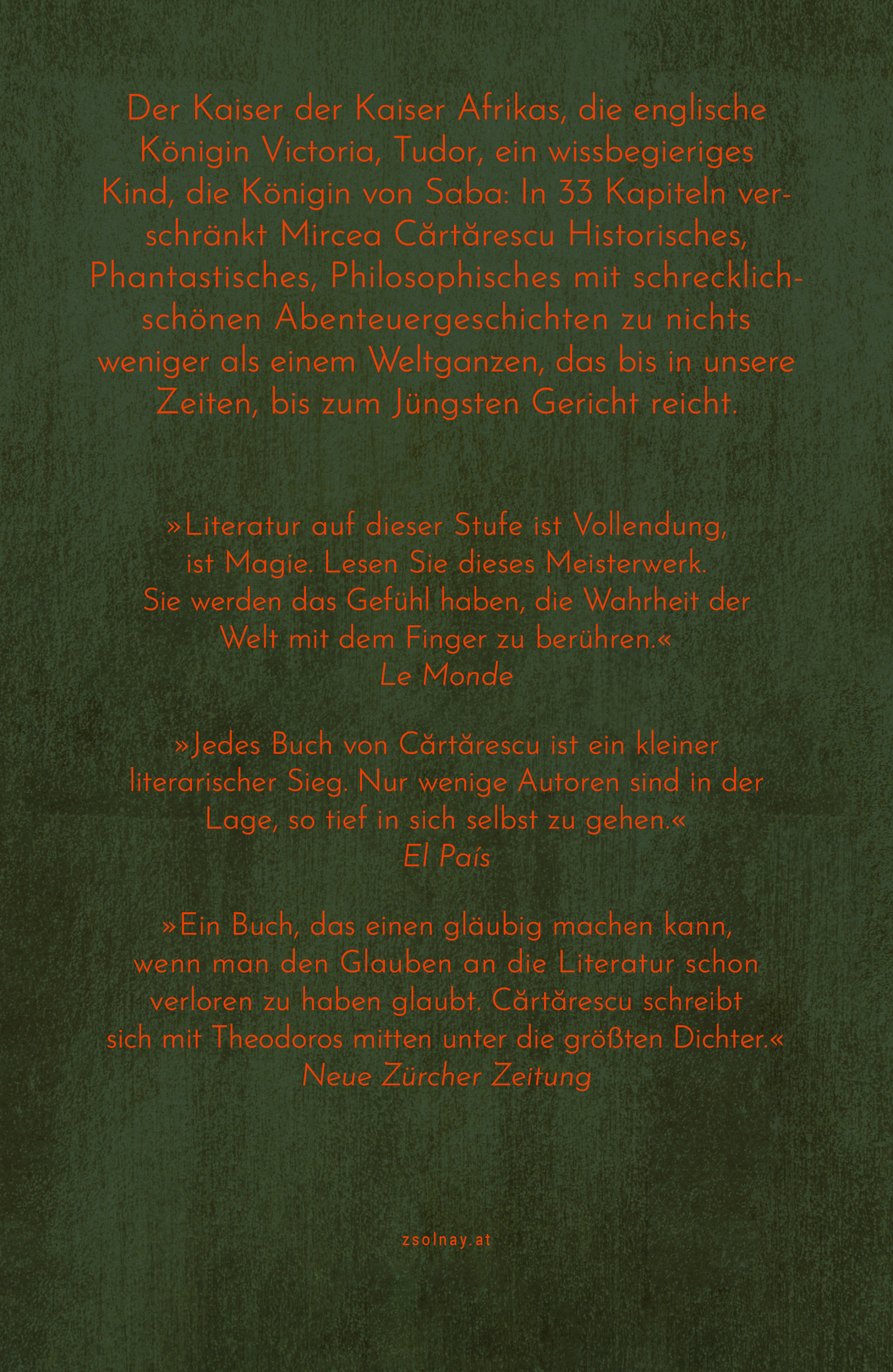 „Den Pistolenlauf noch im Mund, das Hirn verstreut auf dem roten Tisch.“ Ehe die britische Kolonialarmee die Bergfestung Magdala in Schutt und Asche legt und ihn als Geisel nimmt, setzt der äthiopische Kaiser am Ostersonntag des Jahres 1868 seinem Leben ein Ende. Nicht als gekrönter Despot, nicht als plündernder Seeräuber, sondern als Bojarendiener aus der Walachei, heißt es in Mircea Cărtărescus neuem epochalen Roman.