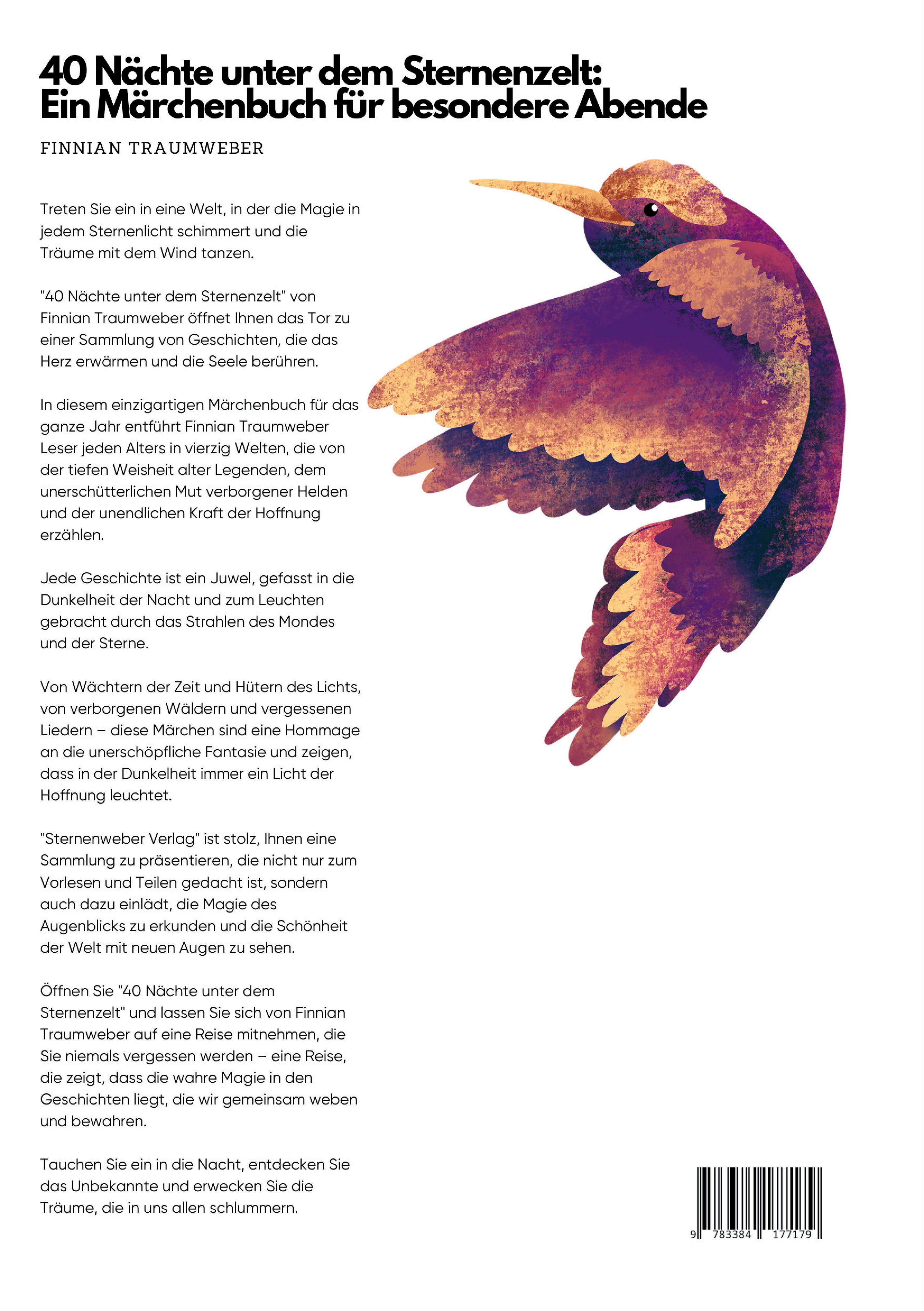 Finnian Traumweber, geboren im Schoß der Natur unter dem leuchtenden Baldachin des Sternenhimmels, wuchs mit Geschichten auf, die so alt sind wie die Zeit selbst. Sein Leben, eine Odyssee durch die Welten der Fantasie und Realität, hat ihn zu einem Meister des geschriebenen Wortes gemacht. Finnian, ein Schüler der alten Mythen und ein Lehrer der Hoffnung, hat sich der Kunst verschrieben, Geschichten zu weben, die die Seele berühren und den Geist erheben. Seine Werke, geprägt von einer tiefen Liebe zur Natur und einem unerschütterlichen Glauben an die Menschlichkeit, dienen als Leuchtfeuer in einer Welt, die nach Licht dürstet. Mit "40 Nächte unter dem Sternenzelt" bietet Finnian Traumweber nicht nur ein Buch, sondern einen Schatz, gefüllt mit den Juwelen der Weisheit und der Magie des Lebens, ein Vermächtnis, das dazu bestimmt ist, Generationen zu inspirieren und zu lehren, dass in jedem von uns ein Funke des Unendlichen glimmt.
