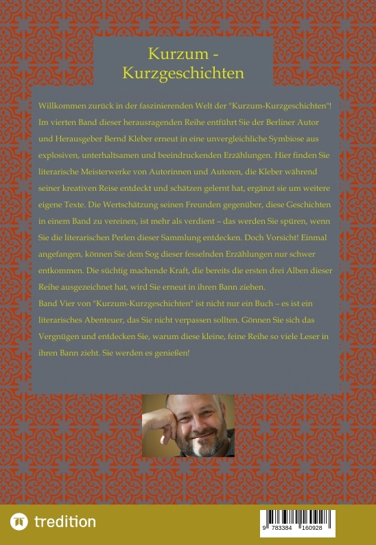 Bernd Kleber wurde 1961 in Berlin geboren, ist bekennender Berliner und lebt und arbeitet hier als Kaufmann. Er schreibt beeindruckende Erzählungen, die nach mehr verlangen. Die Philologin Clara Sinn warnt augenzwinkernd vor diesem Suchtpotential. Wir lachen, schmunzeln, sind gerührt bei seinen Stoffen, die in uns nachhallen. Immer sind es emotional verpackte Geschichten, die nicht so schnell aus dem Kopf gehen. In seinen Storys hält er uns oft einen Spiegel vor oder lässt Themen des Miteinander, gesellschaftliche Aspekte einfließen. Fesselnde Unterhaltung auf hohem Niveau, sensibel illustriert aus seiner fotografischen Sammlung. Von seinen Geschichten wurden einige prämiert und in Anthologien verschiedener Verlage veröffentlicht. Viele kennen ihn auch inzwischen aus seinem erfolgreichen Podcast: „Höre, was zu lesen ist …“.