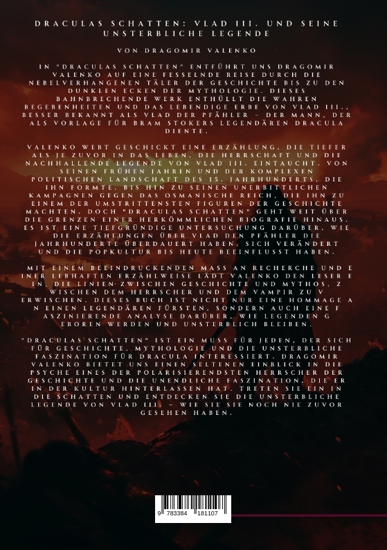 Draculas Schatten: Vlad III. und seine unsterbliche LegendeVon Dragomir ValenkoIn "Draculas Schatten" entführt uns Dragomir Valenko auf eine fesselnde Reise durch die nebelverhangenen Täler der Geschichte bis zu den dunklen Ecken der Mythologie. Dieses bahnbrechende Werk enthüllt die wahren Begebenheiten und das lebendige Erbe von Vlad III., besser bekannt als Vlad der Pfähler - der Mann, der als Vorlage für Bram Stokers legendären Dracula diente.Valenko webt geschickt eine Erzählung, die tiefer als je zuvor in das Leben, die Herrschaft und die nachhallende Legende von Vlad III. eintaucht. Von seinen frühen Jahren und der komplexen politischen Landschaft des 15. Jahrhunderts, die ihn formte, bis hin zu seinen unerbittlichen Kampagnen gegen das Osmanische Reich, die ihn zu einem der umstrittensten Figuren der Geschichte machten. Doch "Draculas Schatten" geht weit über die Grenzen einer herkömmlichen Biografie hinaus. Es ist eine tiefgründige Untersuchung darüber, wie die Erzählungen über Vlad den Pfähler die Jahrhunderte überdauert haben, sich verändert und die Popkultur bis heute beeinflusst haben.Mit einem beeindruckenden Maß an Recherche und einer lebhaften Erzählweise lädt Valenko den Leser ein, die Linien zwischen Geschichte und Mythos, zwischen dem Herrscher und dem Vampir zu verwischen. Dieses Buch ist nicht nur eine Hommage an einen legendären Fürsten, sondern auch eine faszinierende Analyse darüber, wie Legenden geboren werden und unsterblich bleiben."Draculas Schatten" ist ein Muss für jeden, der sich für Geschichte, Mythologie und die unsterbliche Faszination für Dracula interessiert. Dragomir Valenko bietet uns einen seltenen Einblick in die Psyche eines der polarisierendsten Herrscher der Geschichte und die unendliche Faszination, die er in der Kultur hinterlassen hat. Treten Sie ein in die Schatten und entdecken Sie die unsterbliche Legende von Vlad III. - wie Sie sie noch nie zuvor gesehen haben.