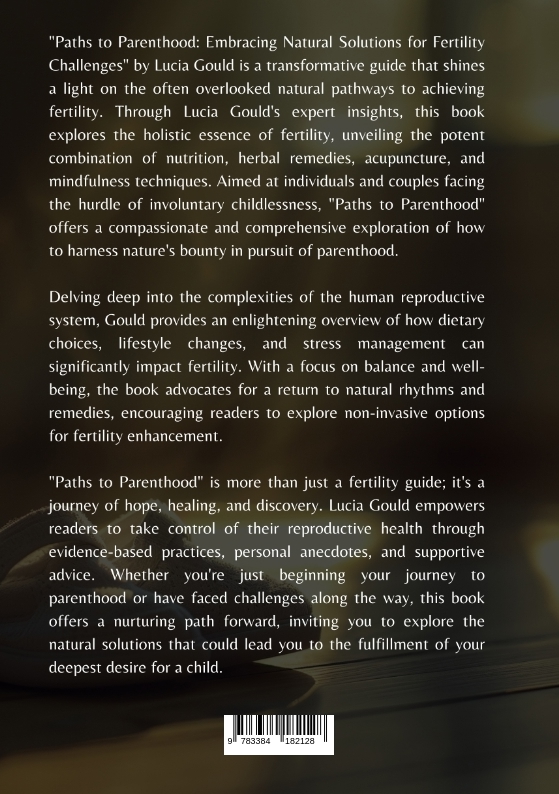 "Paths to Parenthood: Embracing Natural Solutions for Fertility Challenges" by Lucia Gould is a transformative guide that shines a light on the often overlooked natural pathways to achieving fertility. Through Lucia Gould's expert insights, this book explores the holistic essence of fertility, unveiling the potent combination of nutrition, herbal remedies, acupuncture, and mindfulness techniques. Aimed at individuals and couples facing the hurdle of involuntary childlessness, "Paths to Parenthood" offers a compassionate and comprehensive exploration of how to harness nature's bounty in pursuit of parenthood.Delving deep into the complexities of the human reproductive system, Gould provides an enlightening overview of how dietary choices, lifestyle changes, and stress management can significantly impact fertility. With a focus on balance and well-being, the book advocates for a return to natural rhythms and remedies, encouraging readers to explore non-invasive options for fertility enhancement."Paths to Parenthood" is more than just a fertility guide; it's a journey of hope, healing, and discovery. Lucia Gould empowers readers to take control of their reproductive health through evidence-based practices, personal anecdotes, and supportive advice. Whether you're just beginning your journey to parenthood or have faced challenges along the way, this book offers a nurturing path forward, inviting you to explore the natural solutions that could lead you to the fulfillment of your deepest desire for a child.