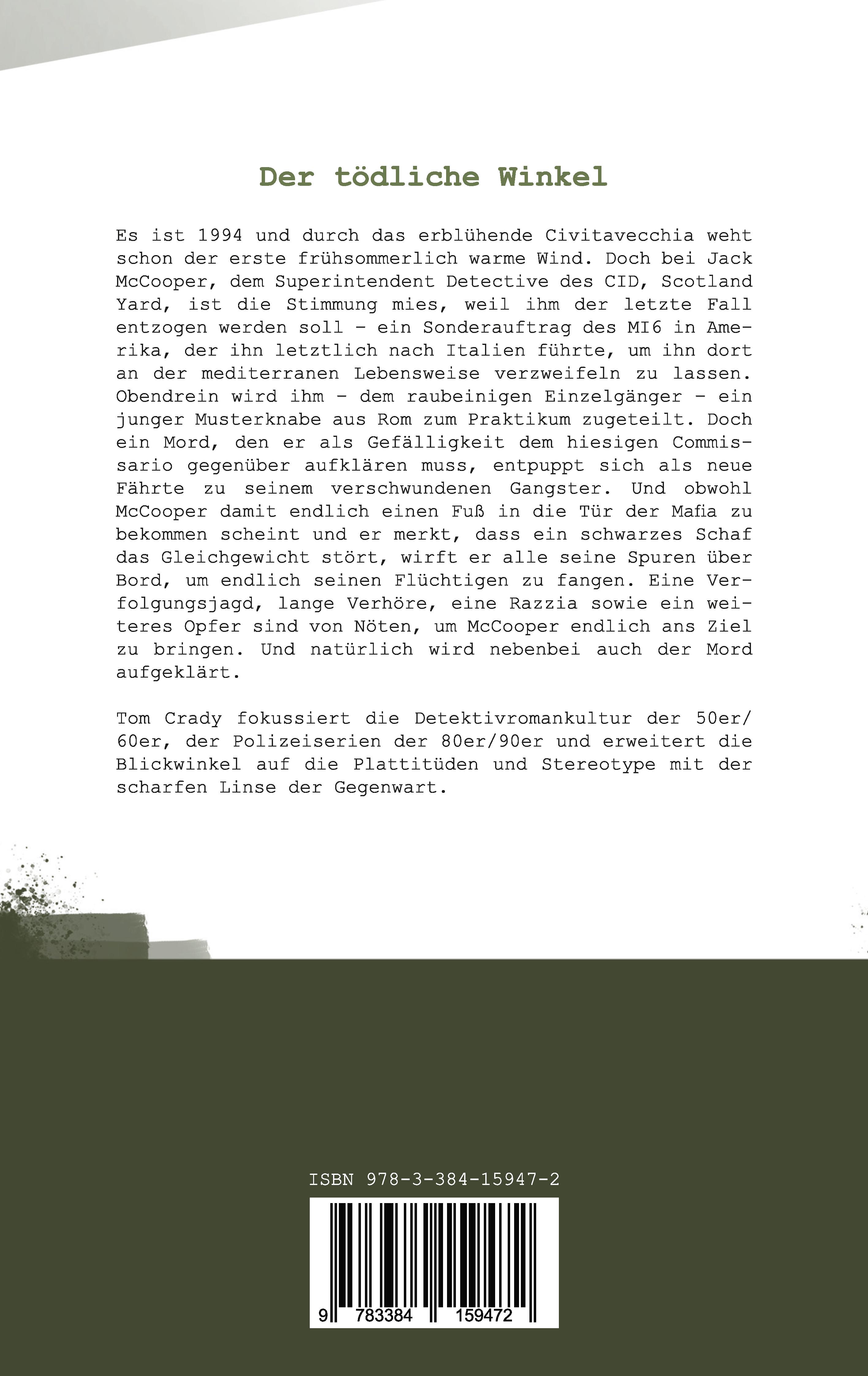 Geboren am 26.10.1980 in Zwickau, Sachsen. Das einzige, wofür meine angeborene Hörschwäche gut war, waren die unglaublichen Beobachtungsskills. Zum Leidwesen meiner Zensuren wurde ich in aller Stille Geschichtenspinner und Comiczeichner (das eher schlecht als recht). Dafür wurde ich wenigstens in der Jugend ein klassischer Fernsehsüchtiger - mit sehr lautem Fernseher. Der Name "Tom Crady" entspringt einem Wortspiel eines Freundes, der mit mir auf Sprachreise in London war, wo keiner meinen Nachnamen aussprechen konnte. Er meinte, dass Tom Crady als - damaliger - Blues und Country-Musiker wie angegossen passen würde. Seither steht er für alles steht, was ich im Bereich Kunst mache. Jahre darauf - gegen 2007 -, inspiriert durch tausende von Serien und gelesener Kriminalromane, ließ ich ein 20-seitiges Kurzfilm-Manuskript wieder aufleben, welches ich 1997 für und mit meinen Klassenkameraden für ein Projekt schrieb. Ich bearbeitete das erste Mal McCooper neu. Nach schwierigen Zeiten und tausender gestapelter Ideen kam ich erst 2017 zur Überarbeitung. Das machte ich bis 2019 sehr viele Male. Dann machte es Klick und ich schrieb eine neue Geschichte (mein zweiten McCooper-Fall: "Der Ton macht die Musik") der mich endlich für den ersten Teil fit machte. Dank Corona dann kam ich zum schreiben von insgesamt aktuell 6 Romanen und inzwischen habe ich bis zum 10ten vor konzipiert. Band zwei ist draußen.