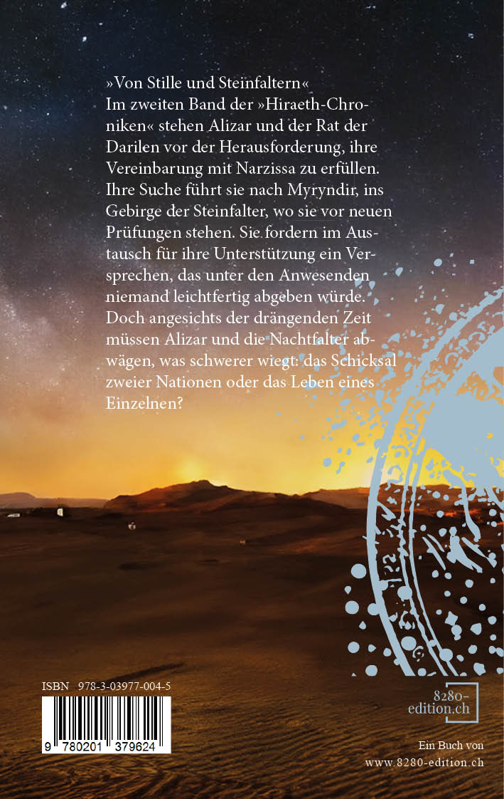 Im zweiten Band der »Hiraeth-Chroniken« stehen Alizar und der Rat der Darilen vor der Herausforderung, ihre Vereinbarung mit Narzissa zu erfüllen. Ihre Suche führt sie nach Myryndir, ins Gebirge der Steinfalter, wo sie vor neuen Prüfungen stehen. Sie fordern im Austausch für ihre Unterstützung ein Versprechen, das unter den Anwesenden niemand leichtfertig abgeben würde. Doch angesichts der drängenden Zeit müssen Alizar und die Nachtfalter abwägen, was schwerer wiegt: das Schicksal zweier Nationen oder das Leben eines Einzelnen?