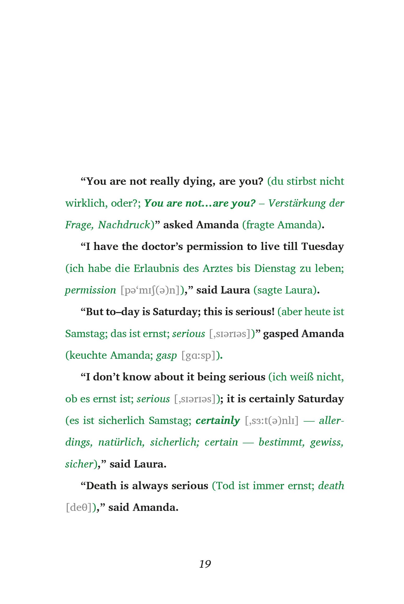 Entdecken Sie die Welt der Fremdsprachen auf eine ganz neue Weise mit der Lesemethode von Ilya Frank, perfekt für alle ab dem Sprachniveau A2. Diese innovative Methode kombiniert Originaltexte mit klaren, direkten Übersetzungen und bietet zusätzliche Erläuterungen direkt im Lesefluss, um ein tiefes Verständnis und schnelles Lernen zu fördern. Ob Sie Ihre Sprachkenntnisse verbessern oder in eine neue Sprache eintauchen möchten, diese Methode bietet ein einzigartiges und effektives Leseerlebnis. Dank der integrierten Hörbücher wird auch das Hörverständnis trainiert. Lesemethode von Ilya Frank ist ideal für alle, die ihre Sprachkenntnisse effektiv erweitern wollen, ohne den natürlichen Lesefluss zu unterbrechen. Tauchen Sie ein in die Welt von Saki, dem Meister der scharfsinnigen Kurzgeschichte, mit einem exquisiten Ensemble, das Sie gleichermaßen erheitern und provozieren wird."Laura" führt Sie durch eine Geschichte, die mit dem Übernatürlichen flirtet, gewürzt mit einer Prise schwarzen Humors, die die Unvorhersehbarkeiten des Schicksals erforscht.In "The Story-Teller" werden Sie Zeuge, wie ein einfacher Akt des Erzählens in der Lage ist, die Grenzen zwischen der Langeweile des Alltags und den ungeahnten Höhen der Fantasie zu sprengen."Sredni Vashtar" taucht tief in die dunklen Ecken der kindlichen Vorstellungskraft ein, wo Glaube und Realität auf gefährliche Weise miteinander verschmelzen."The Lumber Room" ist eine köstliche Satire, die die sorglose Welt der Erwachsenen durch die brillant scharfen Augen eines Kindes darstellt, das in seinem eigenen Akt des stillen Aufbegehrens triumphiert.Abschließend beleuchtet "The Philanthropist and the Happy Cat" die Ironie der menschlichen Natur in einer Geschichte, die gleichermaßen nachdenklich stimmt und ein Lächeln auf die Lippen zaubert.Saki, mit bürgerlichem Namen H.H. Munro, fordert in diesen Geschichten die Konventionen seiner Zeit heraus und enthüllt die Absurditäten des sozialen Verhaltens mit beißendem Witz und einer unverwechselbaren Eleganz des Ausdrucks. Diese Sammlung ist ein literarischer Genuss, der die Zähne zeigt, lacht und gleichzeitig zum Nachdenken anregt. Holen Sie sich jetzt Ihr Exemplar und lassen Sie sich in die fesselnde Welt von Sakis Vorstellungskraft entführen.Ungekürzter Originaltext. Zweisprachiges Buch Englisch-Deutsch mit Audio-Online. Innovative Lesemethode von Ilya Frank: https://easyoriginal.com/lesemethode/