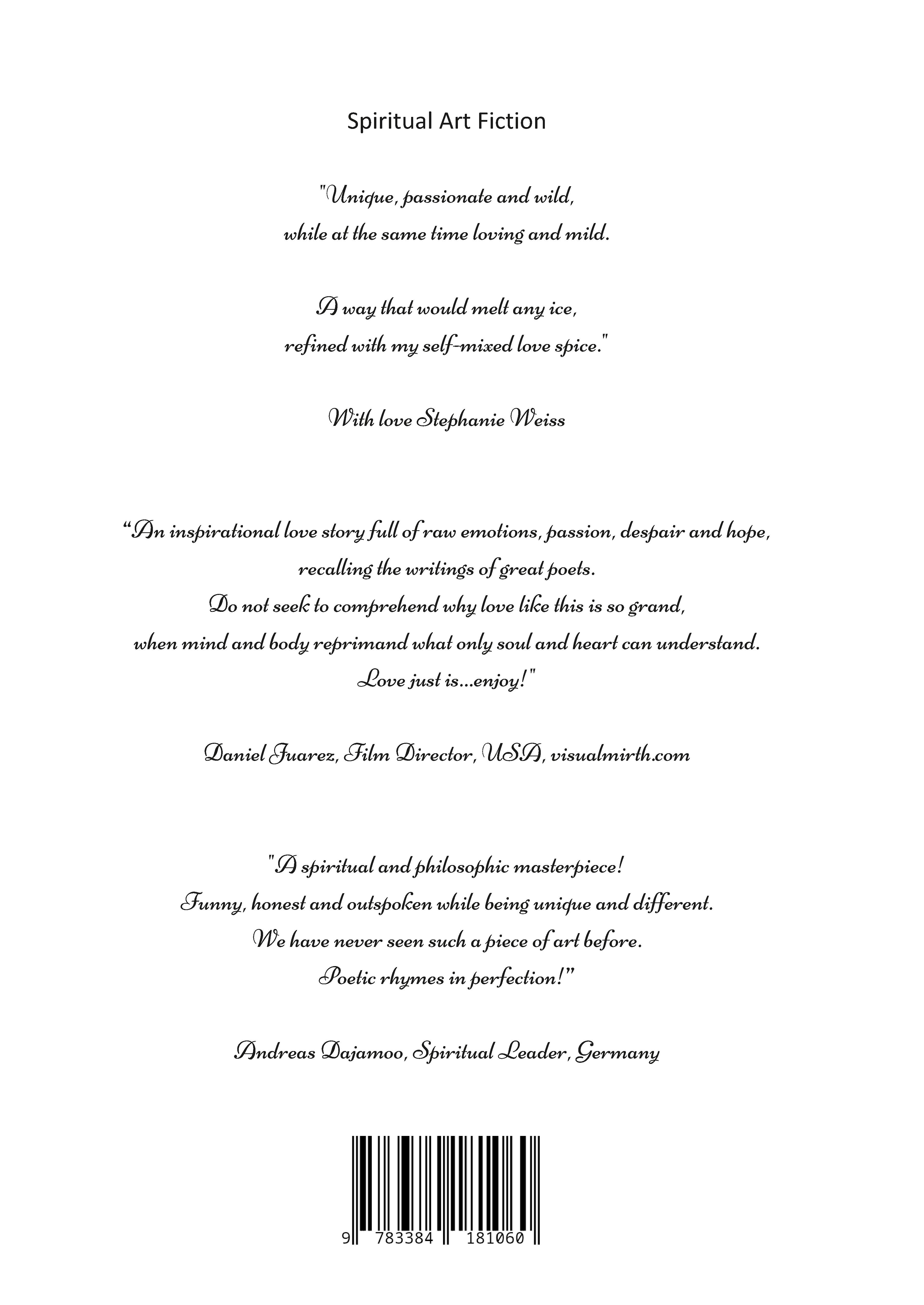 Spiritual Art Fiction"Unique, passionate and wild,while at the same time loving and mild.A way that would melt any ice,refined with my self-mixed love spice."With love Stephanie Weiss"An inspirational love story full of raw emotions, passion, despair and hope, recalling the writings of great poets.Do not seek to comprehend why love like this is so grand, when mind and body reprimand what only soul and heart can understand.Love just is...enjoy!"Daniel Juarez, Film Director, USA, visualmirth.com"A spiritual and philosophic masterpiece!Funny, honest and outspoken while being unique and different.We have never seen such a piece of art before.Poetic rhymes in perfection!"Andreas Dajamoo, Spiritual Leader, Germany