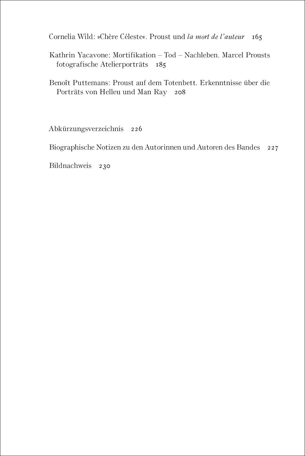 Der vorliegende Band, hervorgegangen aus einem internationalen Symposion aus Anlass des 100. Todestags von Marcel Proust, bietet zwölf Blickwinkel auf die verschiedenen Facetten von Todeserfahrung und Todesdarstellung in seinem Leben und Werk.