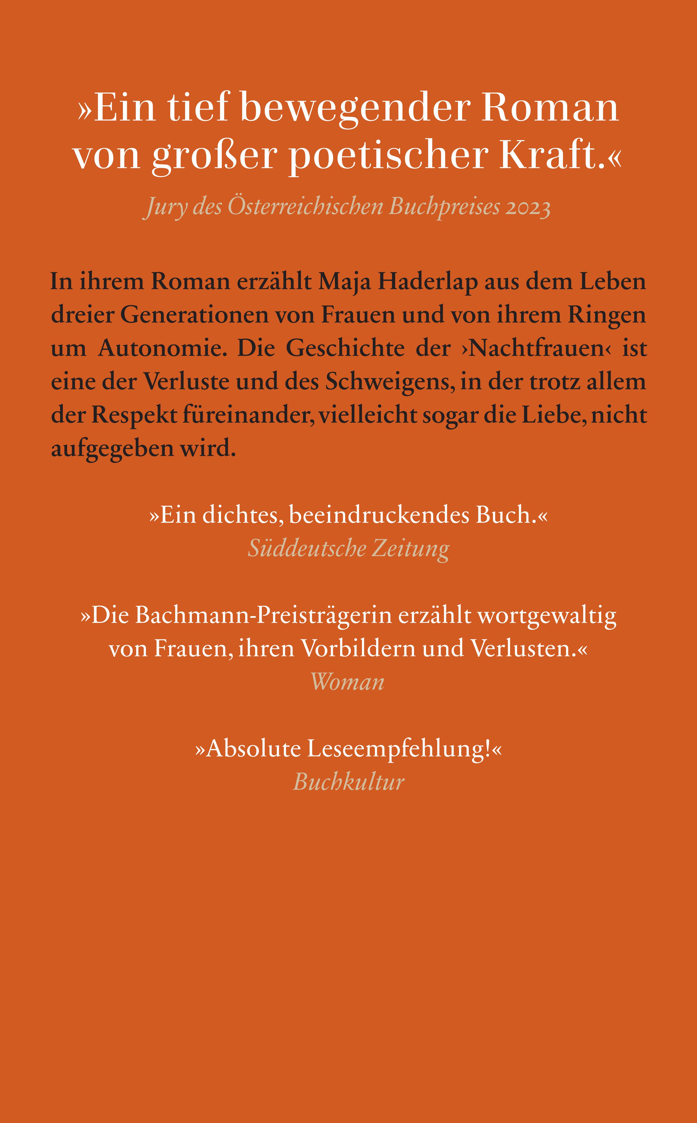 Maja Haderlap wurde in Bad Eisenkappel / Železna Kapla (Kärnten) geboren. Nach einem Studium der Theaterwissenschaft und Germanistik war sie Lehrbeauftragte an der Universität Klagenfurt und lange Jahre Chefdramaturgin am Stadttheater Klagenfurt. Sie veröffentlichte Lyrik in slowenischer Sprache, ehe sie für einen Auszug aus ihrem Romandebüt Engel des Vergessens 2011 mit dem Ingeborg-Bachmann-Preis ausgezeichnet wurde. Weitere renommierte Preise folgten, wie der Max Frisch-Preis 2018 oder der Christine Lavant Preis 2021. Nachtfrauen ist ihr erstes Buch im Suhrkamp Verlag.