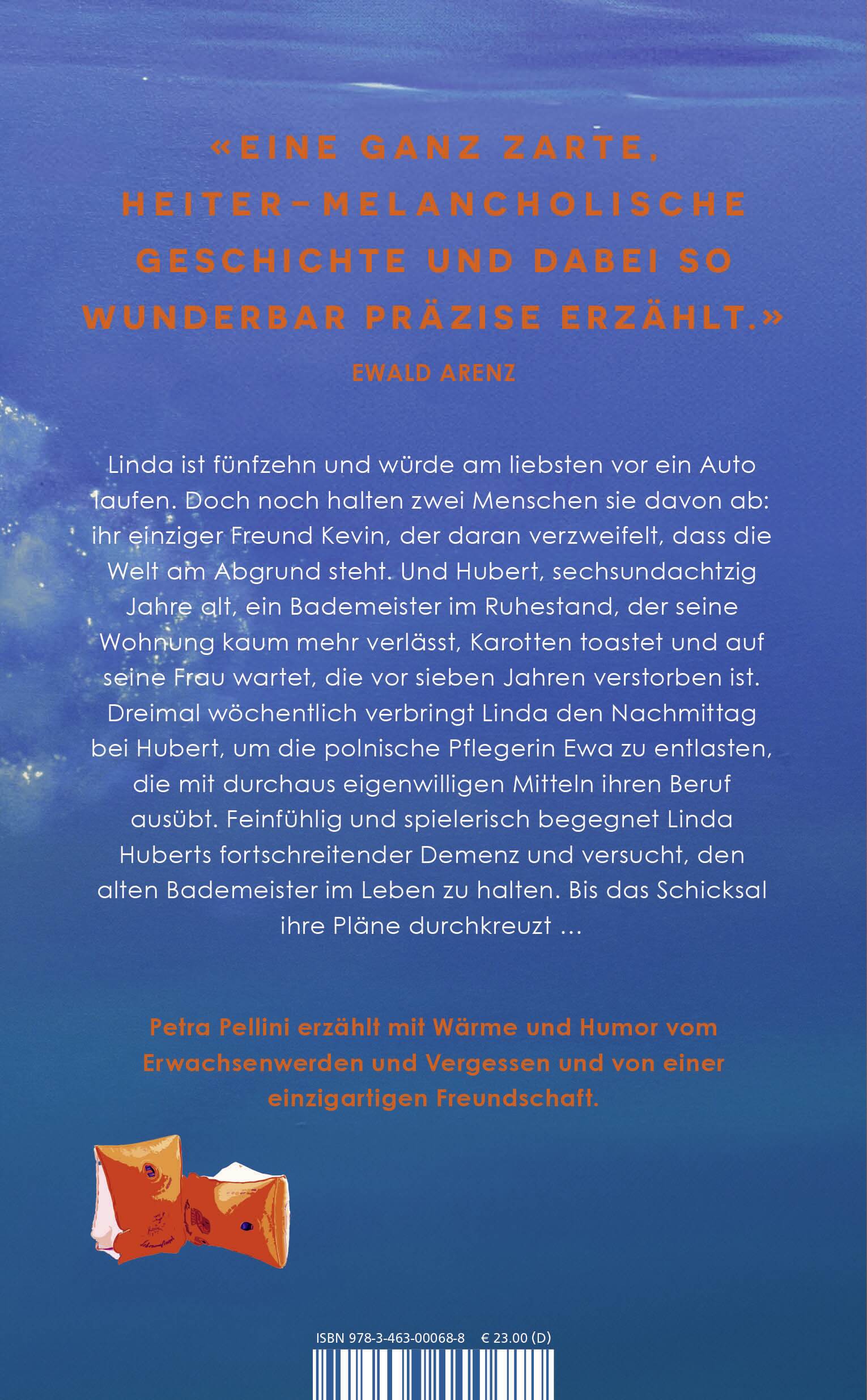 Linda ist fünfzehn und würde am liebsten vor ein Auto laufen. Doch noch halten zwei Menschen sie davon ab: ihr einziger Freund Kevin, der daran verzweifelt, dass die Welt am Abgrund steht. Und Hubert, sechsundachtzig Jahre alt, ein Bademeister im Ruhestand, der seine Wohnung kaum mehr verlässt, Karotten toastet und auf seine Frau wartet, die vor sieben Jahren verstorben ist. Dreimal wöchentlich verbringt Linda den Nachmittag bei Hubert, um die polnische Pflegerin Ewa zu entlasten, die mit durchaus eigenwilligen Mitteln ihren Beruf ausübt. Feinfühlig und spielerisch begegnet Linda Huberts fortschreitender Demenz und versucht, den alten Bademeister im Leben zu halten. Bis das Schicksal ihre Pläne durchkreuzt ...