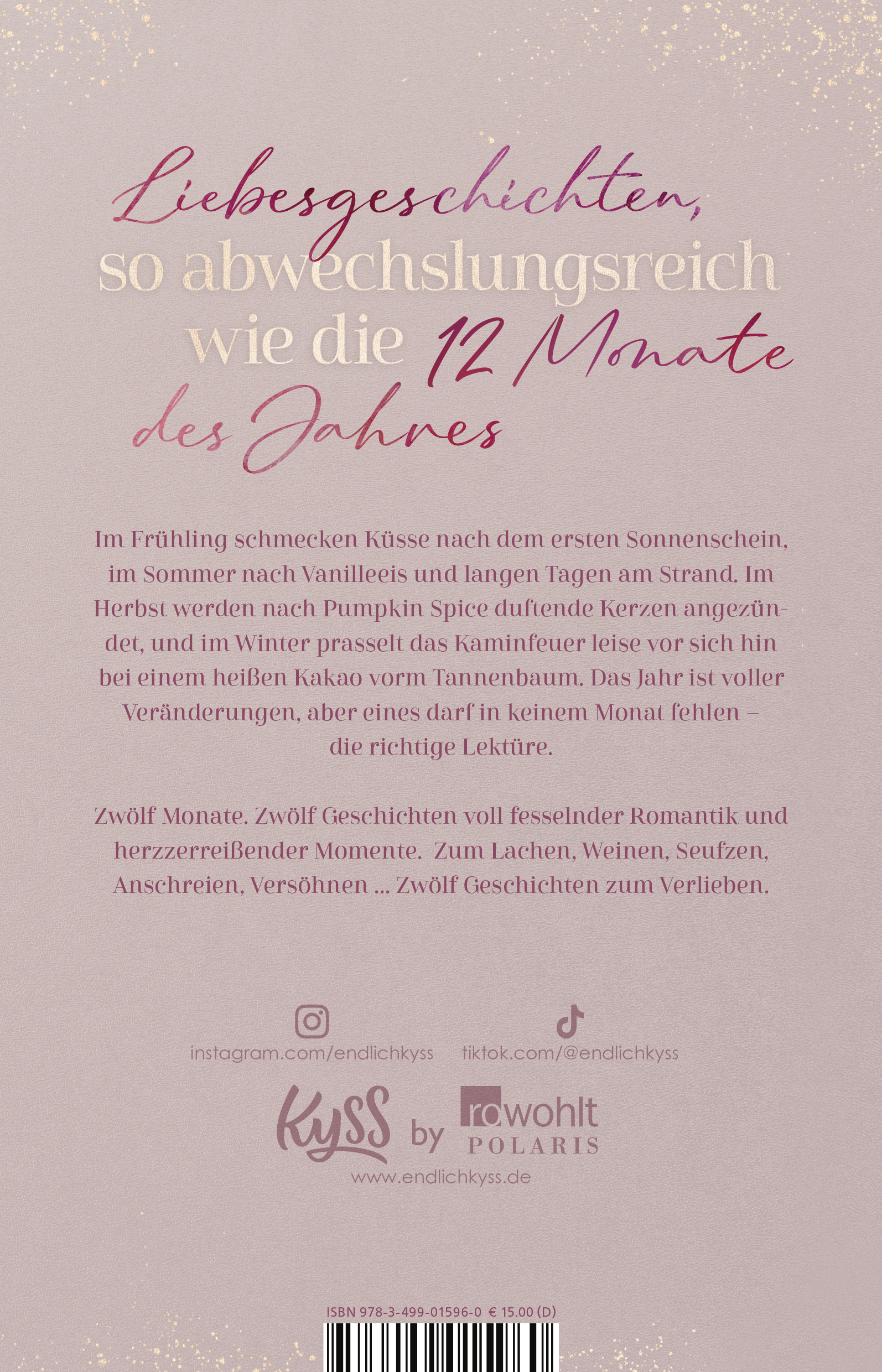 Im Frühling schmecken Küsse nach dem ersten Sonnenschein, im Sommer nach Vanille-Eis und langen Tagen am Strand. Im Herbst werden nach Pumpkin Spice duftende Kerzen angezündet, und im Winter prasselt das Kaminfeuer leise vor sich hin, bei einem heißen Kakao vorm Tannenbaum. Das Jahr ist voller Veränderungen, aber eines darf in keinem Monat fehlen - die richtige Lektüre. Zwölf deutschsprachige Autor:innen haben für jeden Monat des Jahres eine großartige Geschichte geschrieben. Sie sind voll fesselnder Romantik, herzzerreißender Momente und natürlich bis zum Rand gefüllt mit den Tropes, die wir alle lieben. Zum Selbstlesen oder Verschenken: Diese Anthologie lässt die Herzen höherschlagen, das ganze Jahr über.