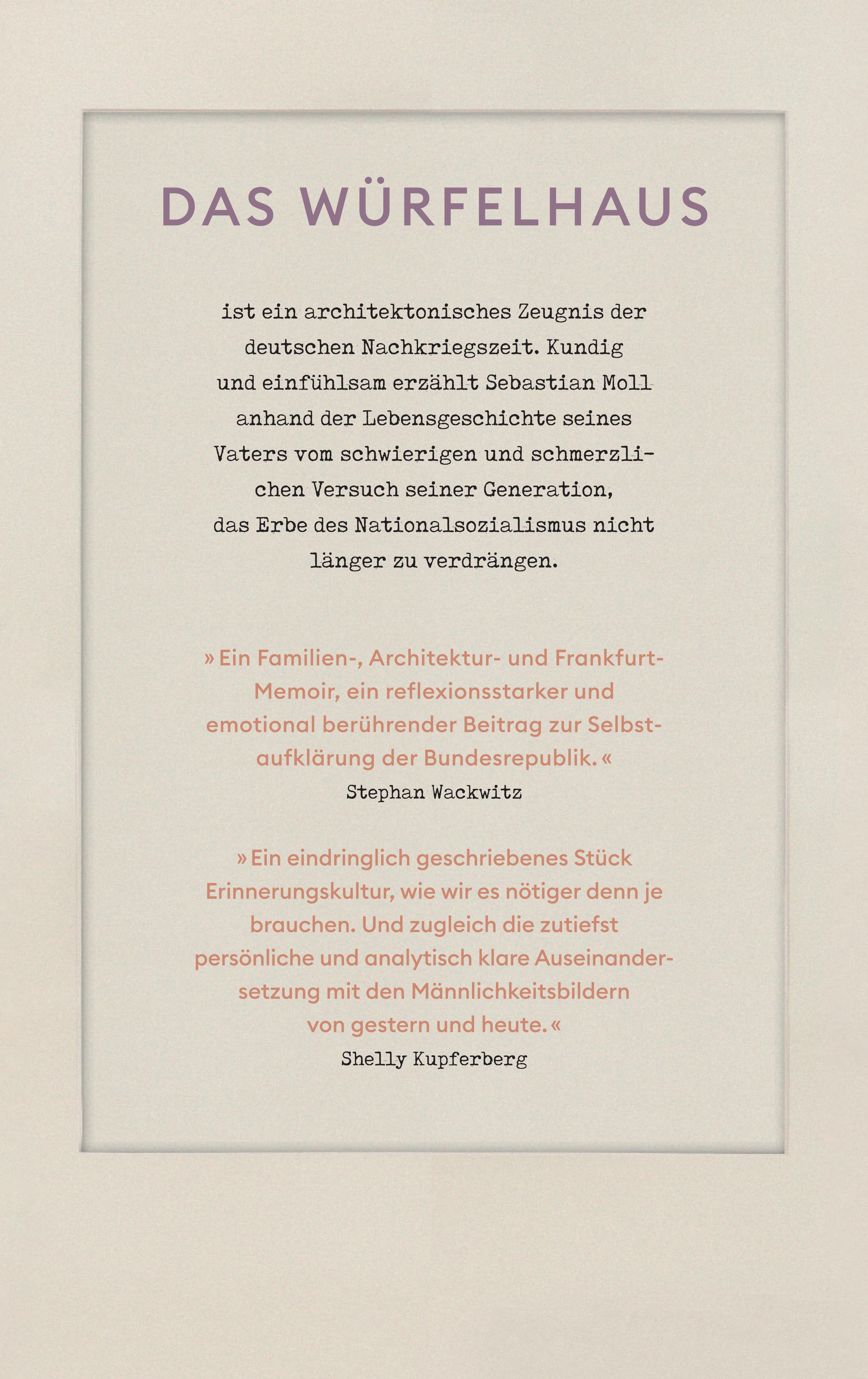Das Würfelhaus ist eine architektonische Freilegung der deutschen Nachkriegszeit. Kundig und einfühlsam erzählt Sebastian Moll anhand seiner Familiengeschichte den schwierigen und schmerzlichen Versuch seiner Generation und mit ihr der deutschen Gegenwart, das Erbe des Nationalsozialismus abzutragen.