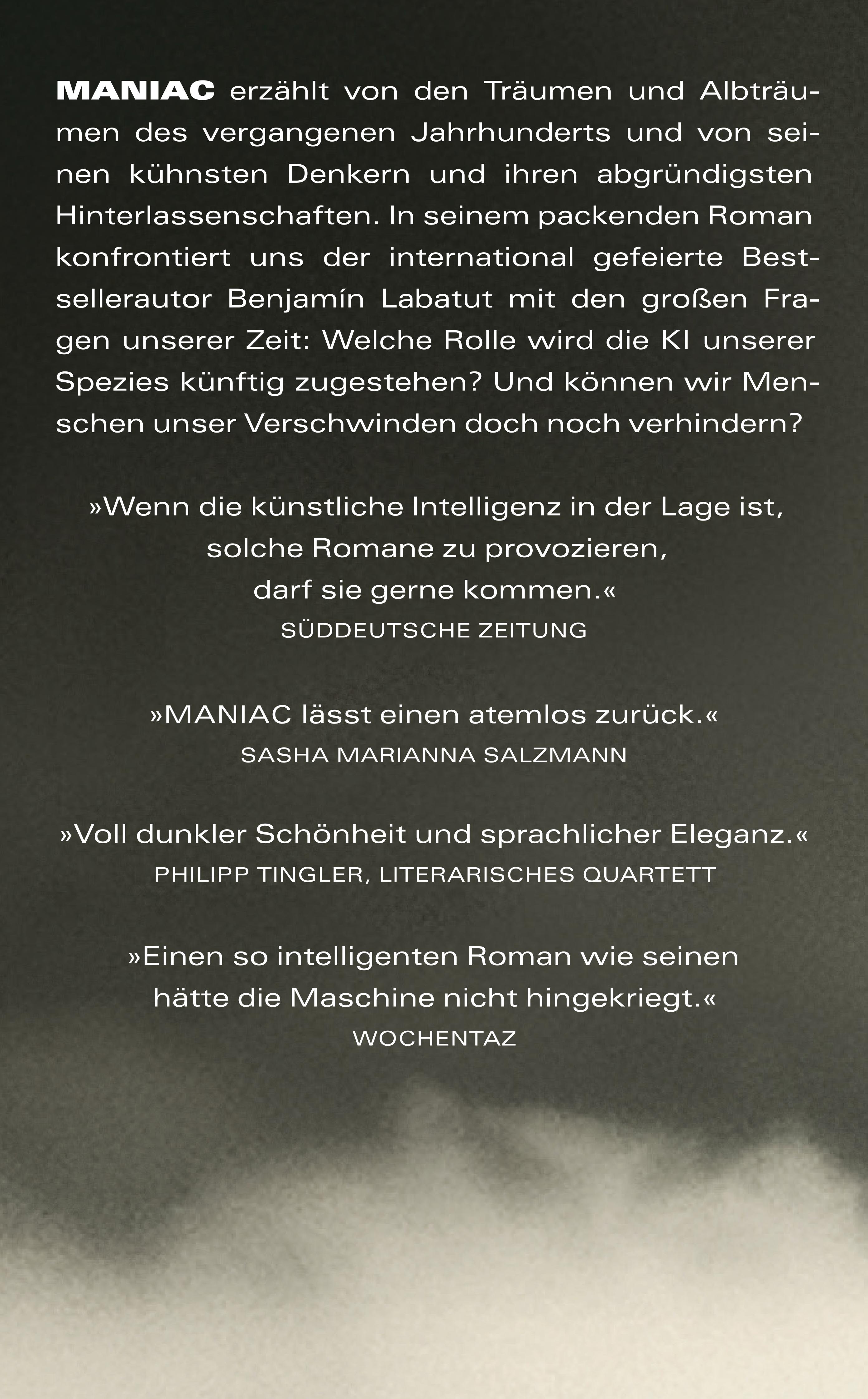 »Das menschliche Unbehagen, das die Begegnung mit künstlicher Intelligenz auslöst, wenn ChatGPT wie von Geisterhand ganze Gedichte schreibt oder Dall-E fotorealistische Bilder in Sekundenschnelle erzeugt, fängt Labatut hervorragend ein.«