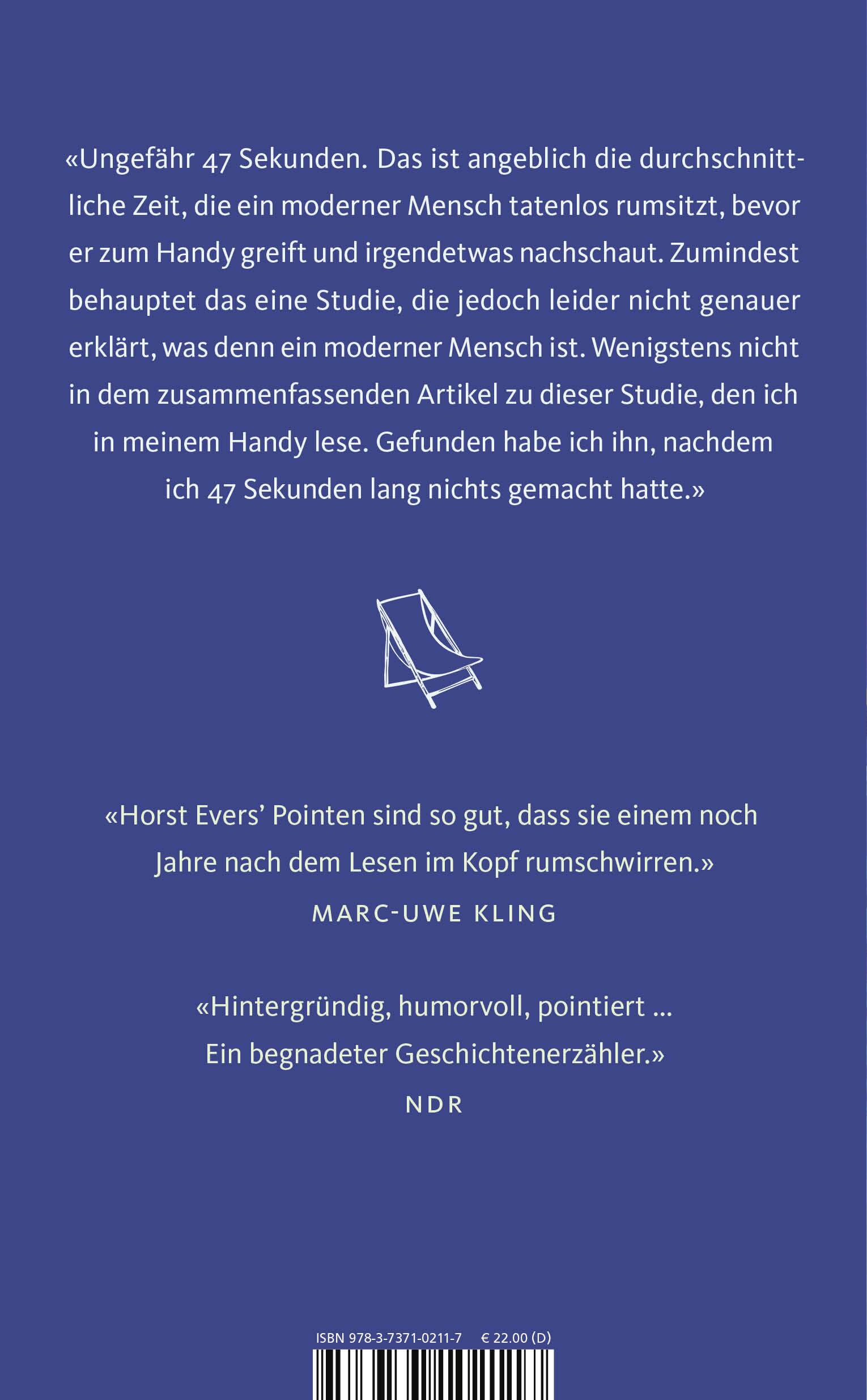 Wie kann es sein, dass wir in jeder kurzen Pause, die uns der Tag bietet, sofort auf unser Handy schauen und uns ablenken? Sind wir vielleicht einfach zu faul zum Nichtstun geworden? Horst Evers geht dieser Frage nach - in kurzen, sehr lustigen Geschichten aus dem Hier und Jetzt. Dort begegnet er Katzen, die seine Pakete entgegennehmen, und Toastern, die unsere Zukunft planen, sowie Nonnen, die ihm die künstliche Intelligenz erklären. Er erzählt von seiner Zeit als Band-Bassist, seiner Begegnung mit Steven Spielberg und der lautesten Verkehrsberuhigung der Welt. Und nicht nur während er Bauarbeiter bewundernd dabei beobachtet, wie sie höchst professionell und ausdauernd besorgt in ein Loch in der Erde gucken, fragt er sich: «Sollten wir unsere Zeit nicht lieber zum ergebnisoffenen Nichtstun nutzen, statt in jeder freien Sekunde nichts von Belang zu machen?» Mit viel Witz, überraschenden Wendungen, Wärme und tatsächlich begründeter Zuversicht nimmt Horst Evers uns mit auf eine Reise durch unsere seltsame Gegenwart. In Geschichten, die keinen einzigen Ratschlag erteilen, aber trotzdem oder gerade deshalb helfen.